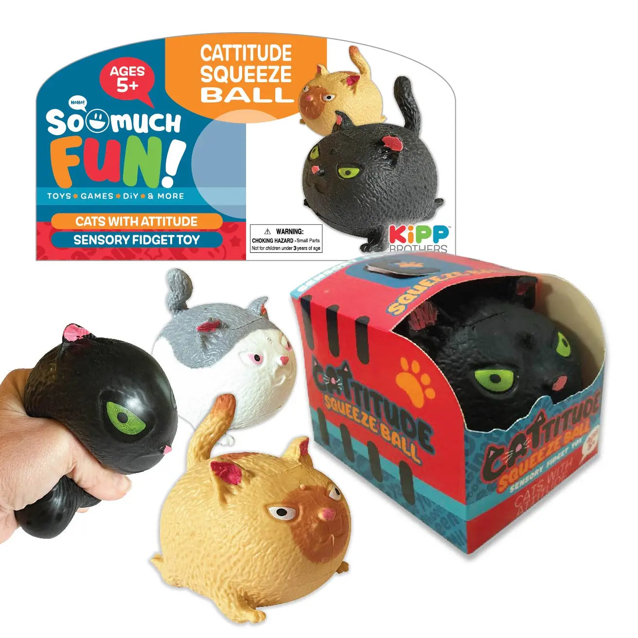 Cats with attitude squishy ball. Four assorted grumpy cat styles are fun to squish. 12 individually boxed balls in inner box with toy bin card included for use on the So Much FUN! Toy Bin Program corrugated display or in the clear toy bin pockets. Product fits tall bins.