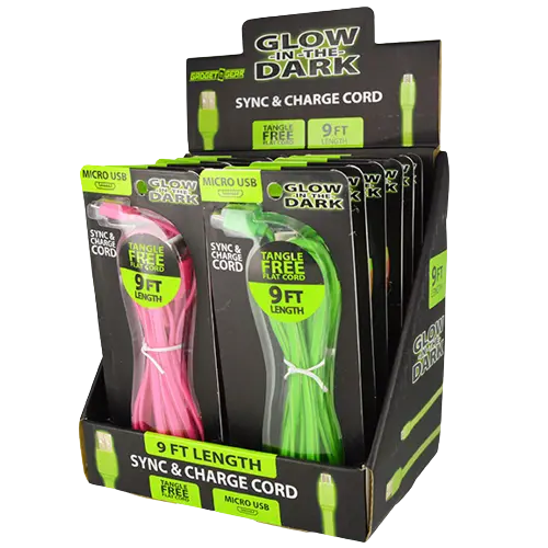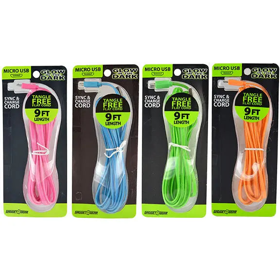 Tangle free 9FT glow in the dark micro sync and charge cable. Comes in assorted neon colors.