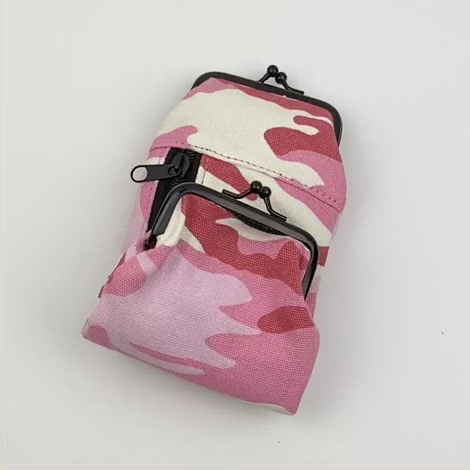 Camo style canvas cigarette pouch with zipper pocket and snap closure coin pouch fits 100's or regular sized cigarettes. Comes in a variety of camo styles.