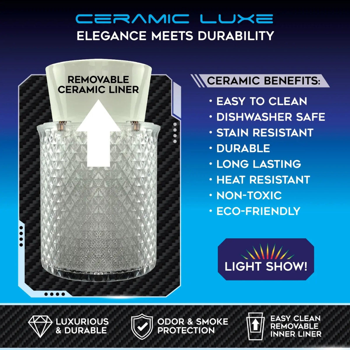 Experience convenience and style with the Ceramic Light Up Butt Bucket. Designed to fit perfectly in your car cup holder, this durable, eco-friendly accessory offers odor and smoke protection with a removable, easy-to-clean ceramic liner. Its heat-resistant, stain-resistant construction ensures long-lasting use, while the press-to-open lid reveals a captivating light show inside. Batteries are included for immediate enjoyment, making it a practical and eye-catching addition to your daily routine.