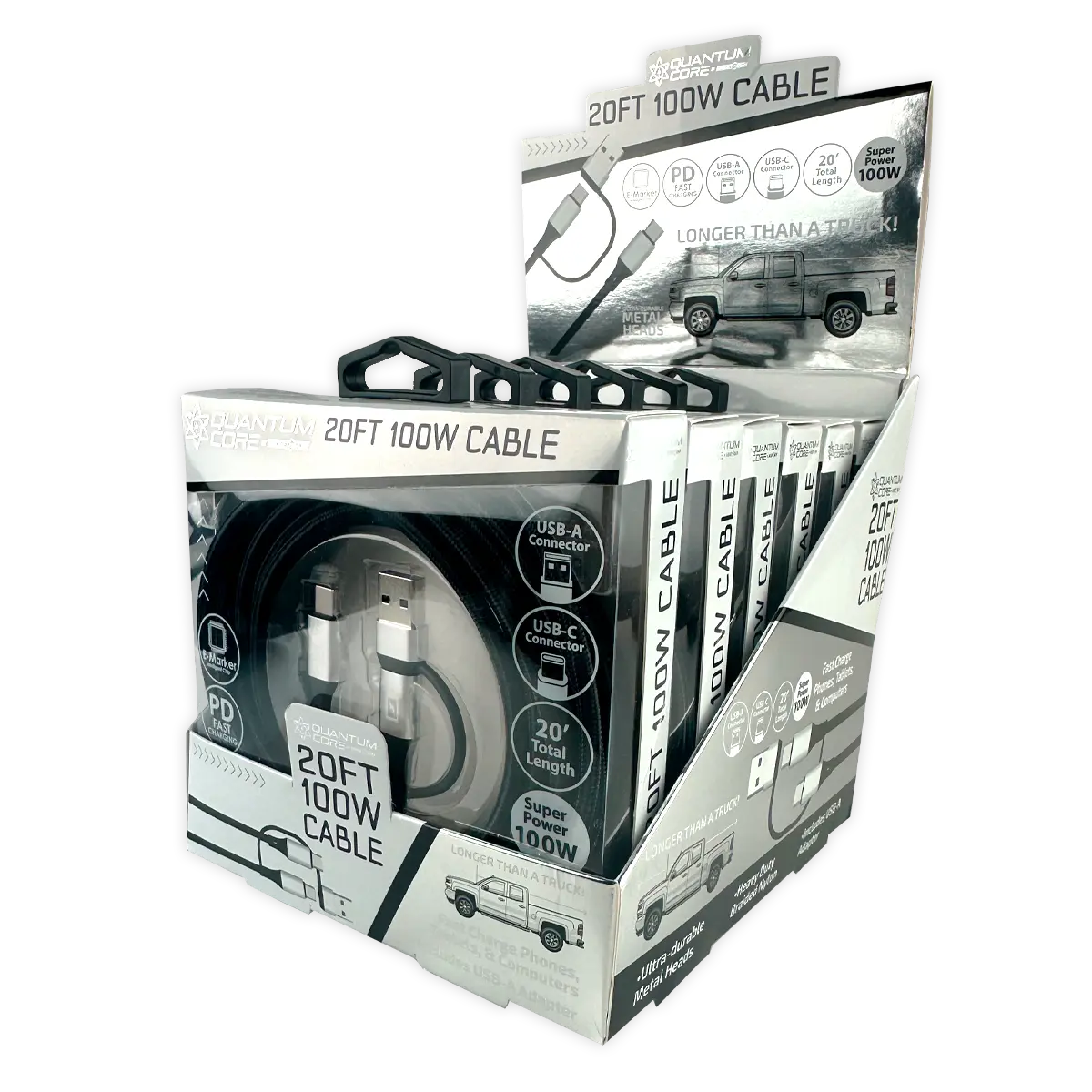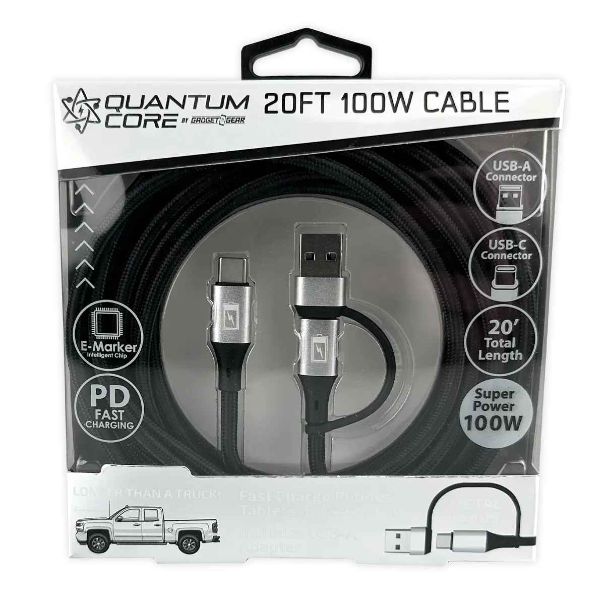 Efficiently charge your devices with our Quantum Core 20ft Charging Cable Quick Switch 2-in-1 Multi-Head USB-C to USB-A. Longer than a truck – and with 100W PD fast charging capability plus 20ft length, this cable is the perfect choice for all your charging needs. Powerful enough for laptop charging. Featuring a reliable USB-C connector , heavy duty braided nylon and an E-Marker Intelligent Chip. It's safe, durable, and ready to switch between devices quickly.