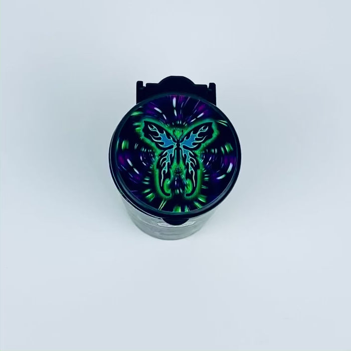 This Full Print Butt Bucket features designs printed completely around the butt bucket and an LED light that comes on when you open the lid. Helps contain smoke odors and keeps your butts out of sight. Fits right in your car cup holder. Comes in a combination of sugar skull and butterfly styles.
