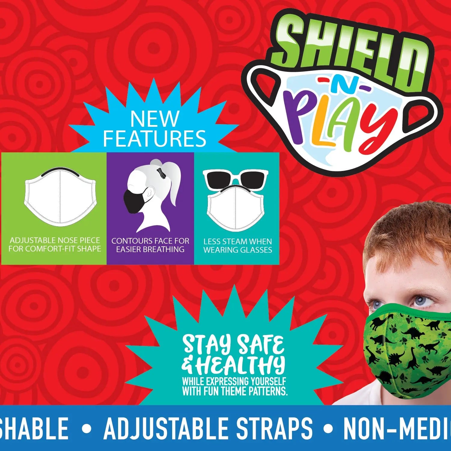 Non-medical grade, washable contoured children's polyester face masks with designs and adjustable straps. Comes in assorted styles. For children age three and up.
