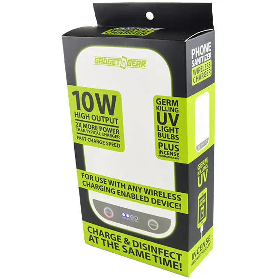 The Sanitizer cell charger works with any wireless charging enabled device! With a 10w high output, it's two times more power than a typical charger. And with it's high speed charging rate, you'll be back on your device in no time! Also sanitizes while charging by using germ-killing UV light bulbs, plus incense.