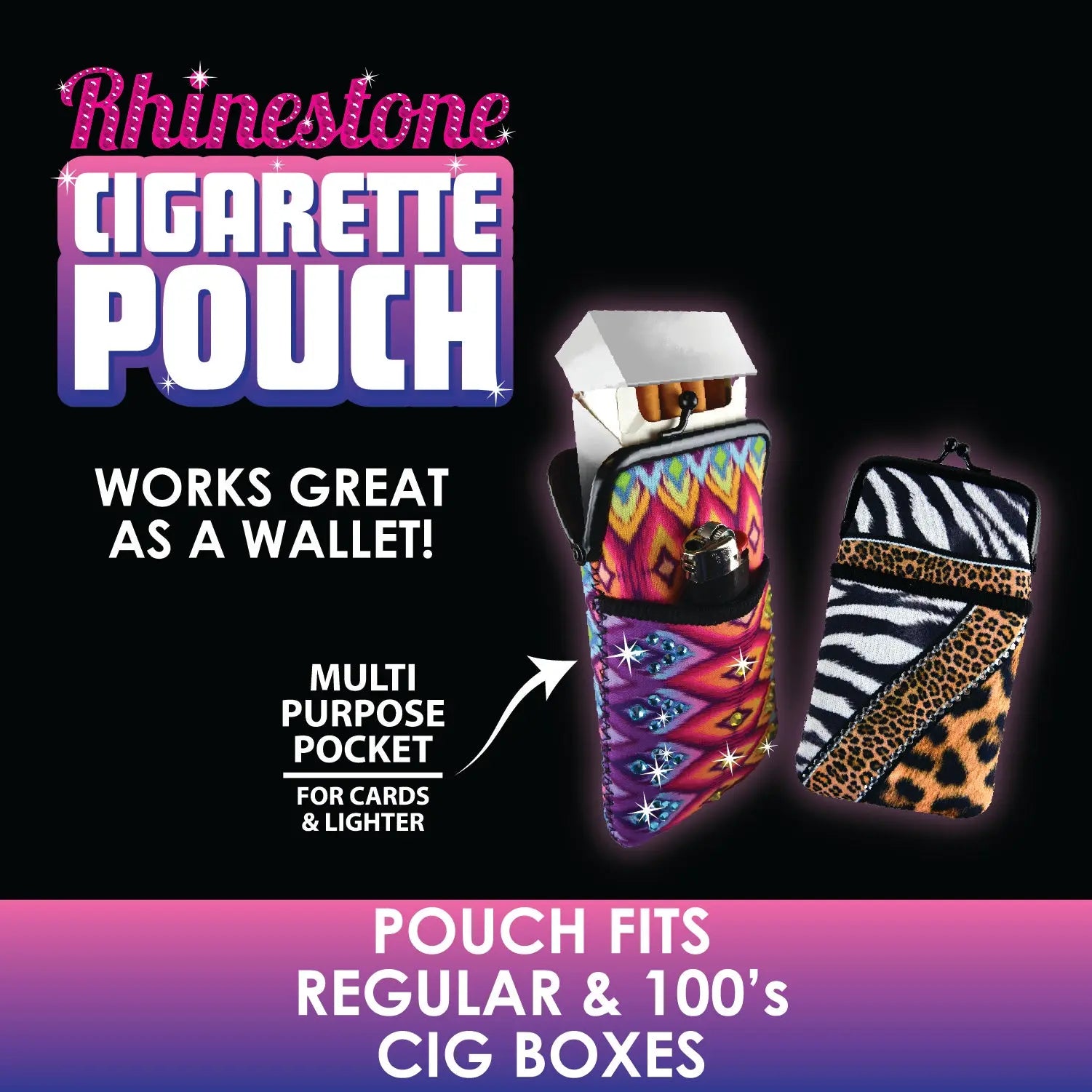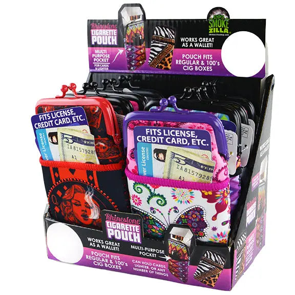 Cigarette Pouch made of water resistant neoprene that comes in different styles with multipurpose pocket. Has fun Rhinestone designs.