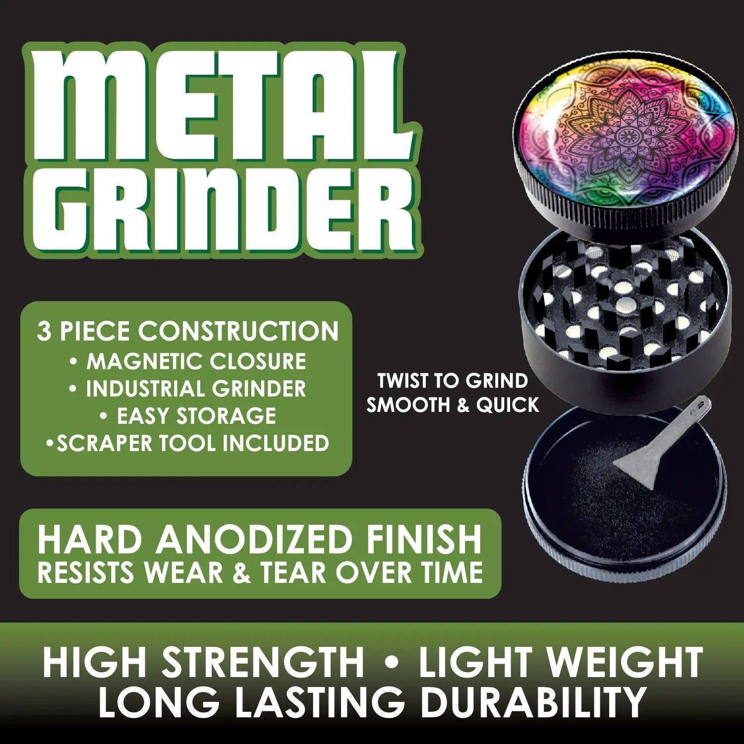 This is an industrial grinder with magnetic closure, 3 piece construction, and a hard anodized finish that resists wear and tear over time. Grinders include a free scraper tool. Grinders come in an assortment of printed designs.