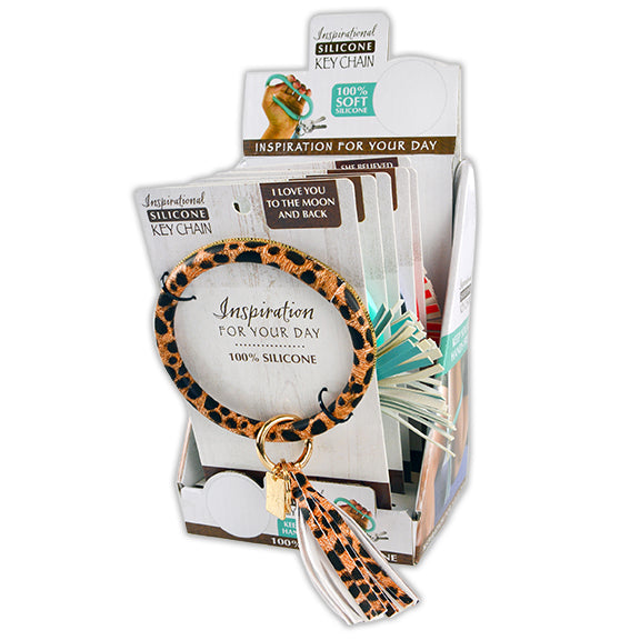 Inspirational 100% Silicone Ring Keychain Wristlet features full print designs PLUS stylish tassels and phrase charms. Each display contains a variety of daily words of encouragement!