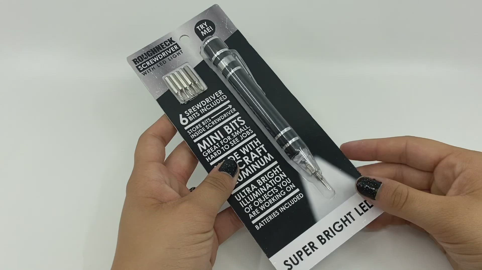 Roughneck LED Screwdriver Tool is a must-have for those tiny fixes! Each tool features ultra bright illumination for viewing objects you're working on. Six screwdriver bits included, and can be stored inside! Each display includes a variety of black, blue and silver.
