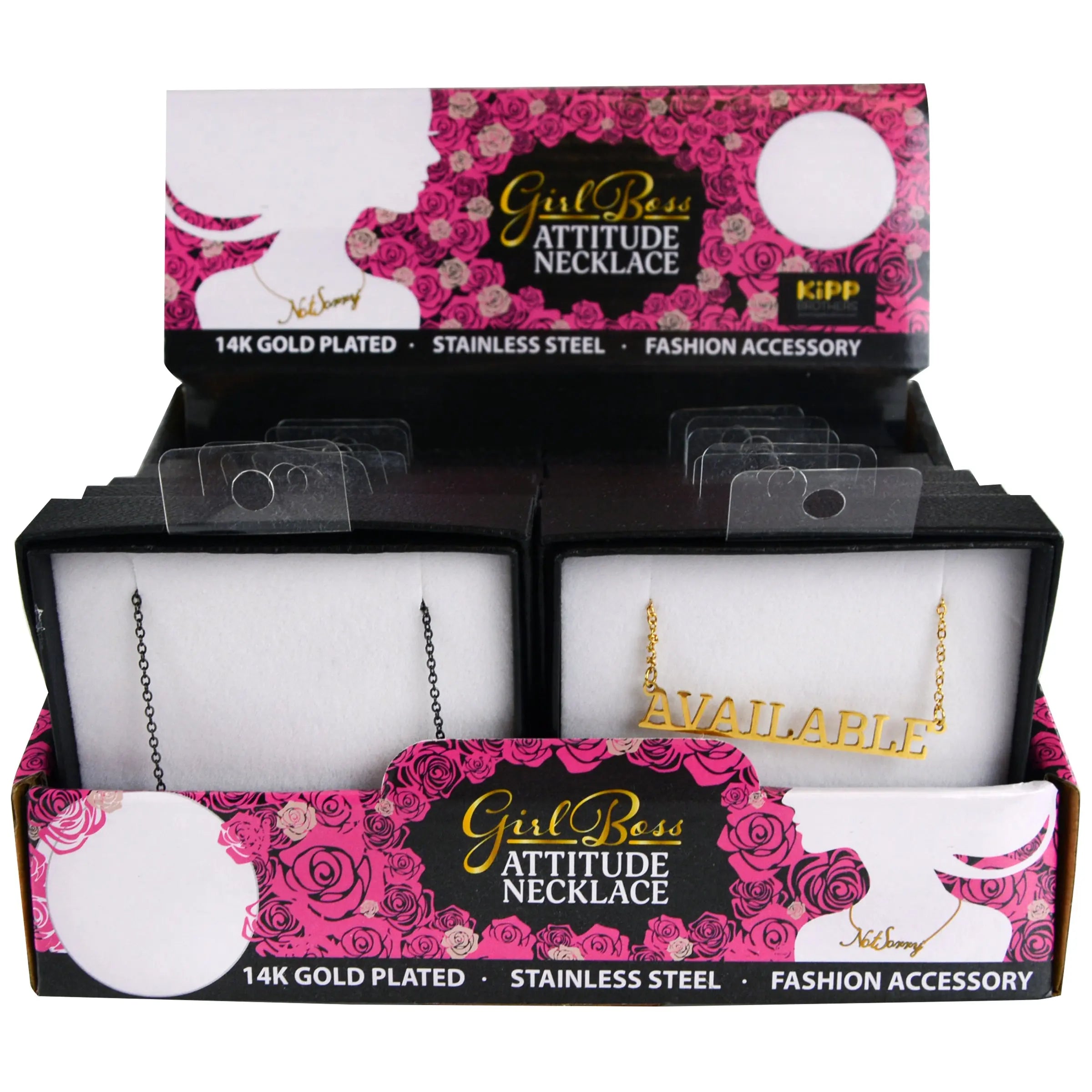 Express yourself with our Girl Boss Attitude necklaces. Featuring 14K gold-plated stainless steel and adjustable 18 inch clasp to fit most. Assorted designs. Each necklace is individually carded and boxed.