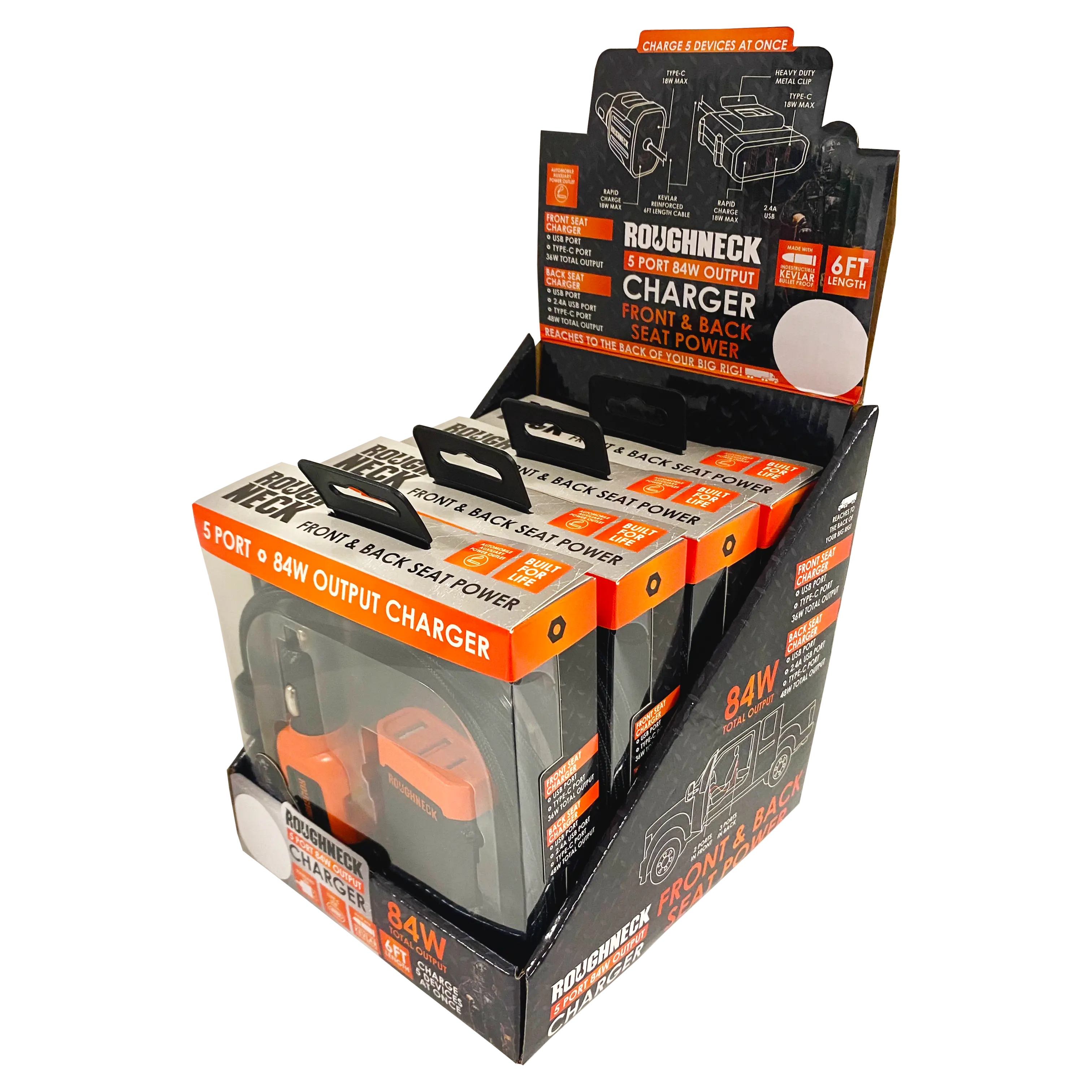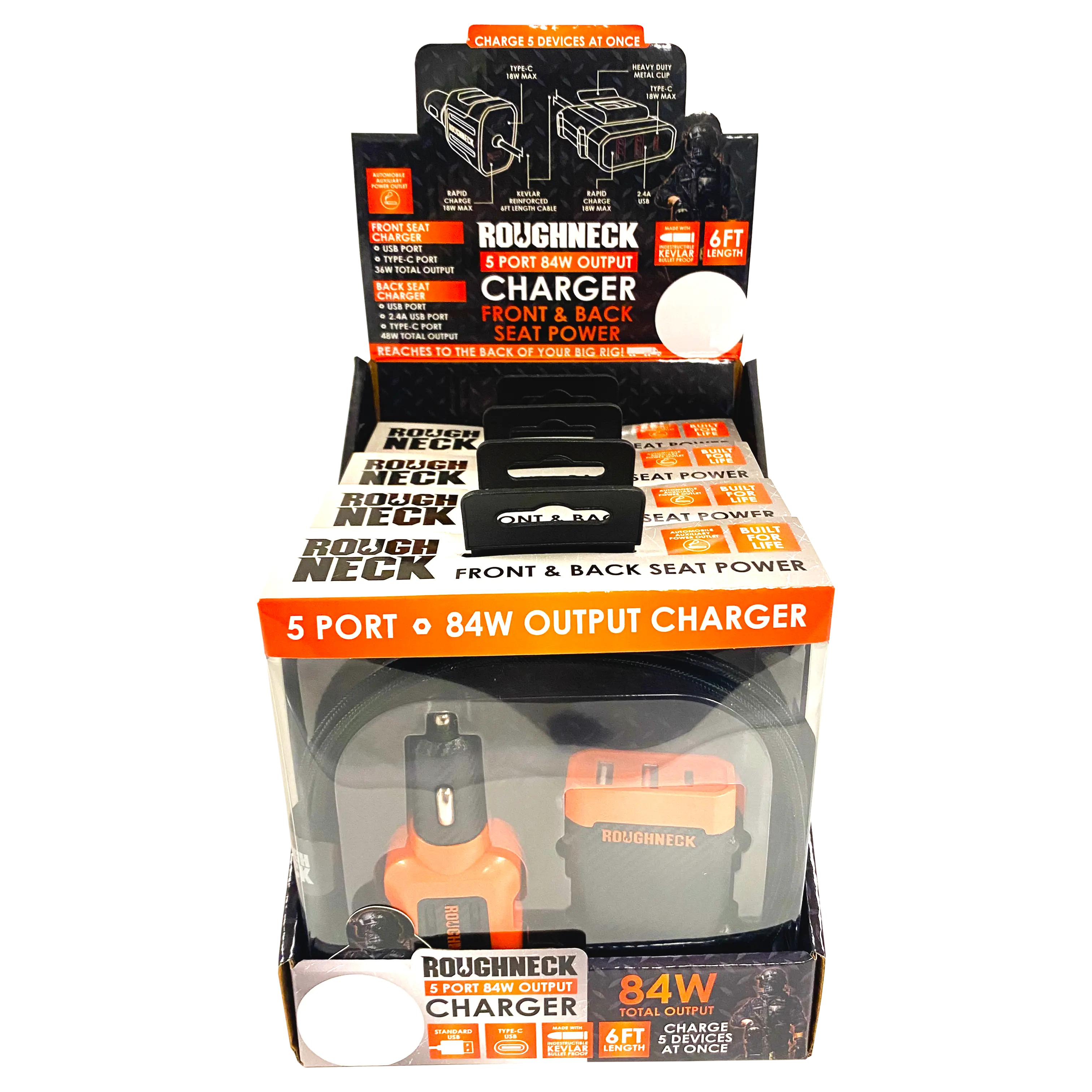 Charges 5 devices at once – 2 ports in front, 3 in back! Reaches to the back of your big rig! Roughneck 6FT front and backseat chargers feature bulletproof Kevlar construction and Qualcomm Quick Charge 3.0 technology. 84W total output. Standard USB. PD Type-C USB. Automobile auxiliary power outlet.