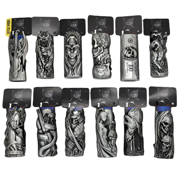 Metal mystic style lighter case with built in bottle opener. Comes in assorted mystic designs including dragons, skulls, and more.