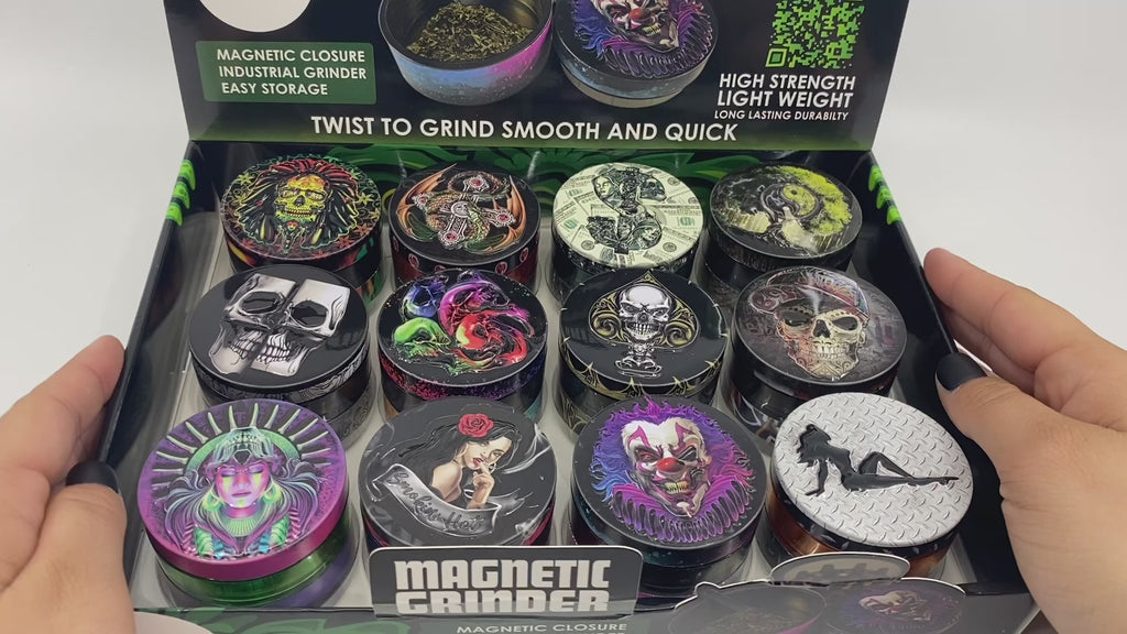 These durable metal/plastic grinders feature magnetic closure and 3 piece construction. Each grinder comes with a free scraper tool. It has a metal lid and bottom and the middle is plastic. Display includes an assortment of printed designs.
