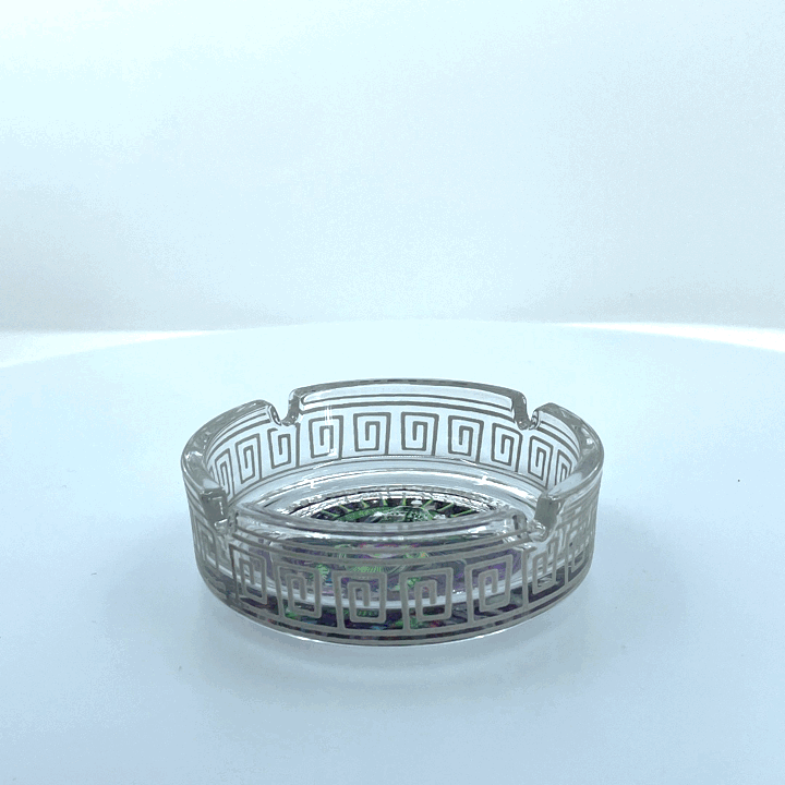 Glow in the Dark Glass Ashtray display includes a mix of various glow-in-the-dark designs printed on the both the bottom and edges. Dishwasher safe, heat resistant — will not burn. Great for cigarettes, coins and more!