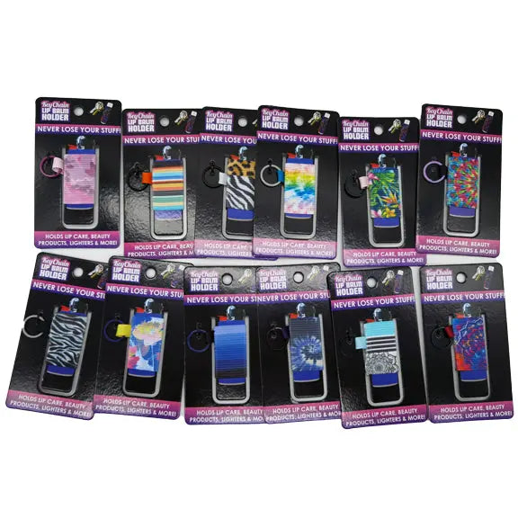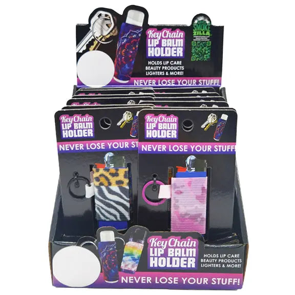 Smokezilla Keychain Lip Balm Holder holds lip care, beauty products, lighters & more! Never lose your stuff! Attach to your keys, backpack, purse, lanyard, belt loop, etc.. Each display contains a variety of trendy tie-dye, floral and animal print styles. 🌈🦓🌹🐆🌺🐅🌸🎨💄🔑🎒👜
