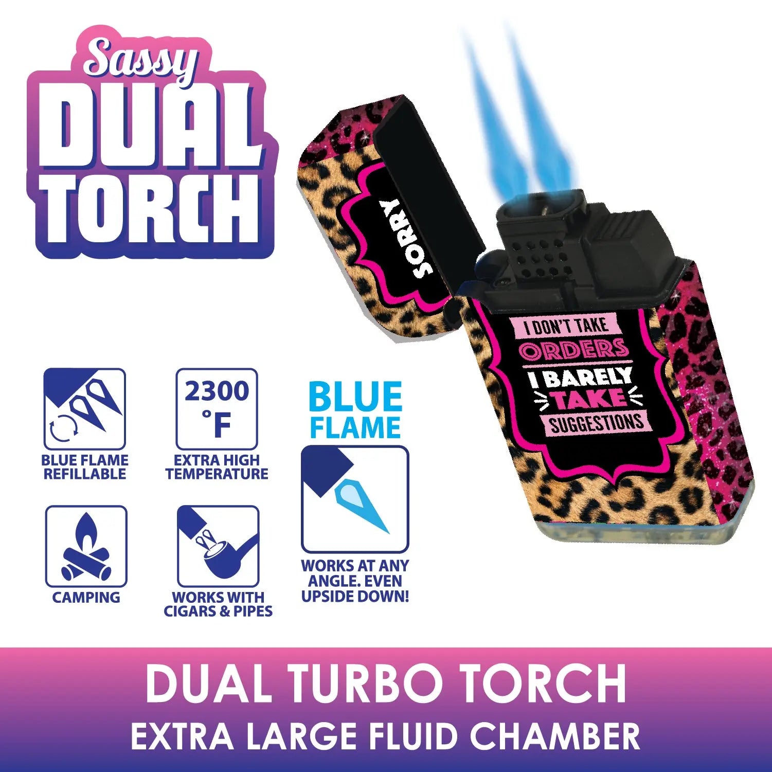ThisSWEET & SASSY adjustable Dual Torch features 2300° dual flames, strong enough for any task! Great for camping, bronzing metal, soldering wires, flaming food, and more! Works at any angle, even upside down! Comes with a built-in safety lock. Features a soft touch finish. Comes with a variety of relatable, witty phrase designs.