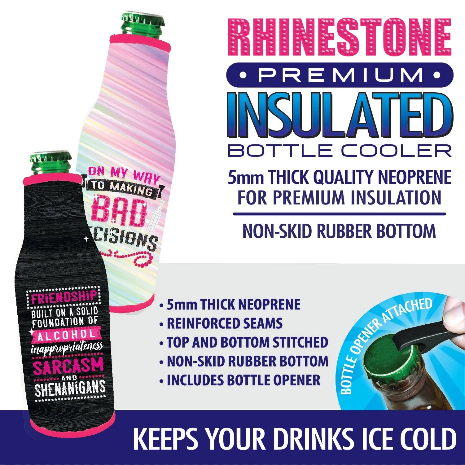Rhinestone can coolers keep your drinks ice cold! 5mm THICK quality neoprene for premium insulation. Featuring non-skid rubber bottom. Each display includes a variety of rhinestone artwork. Reinforced seams, top & bottom stitched. Highest quality on the market, and bottle opener included!
