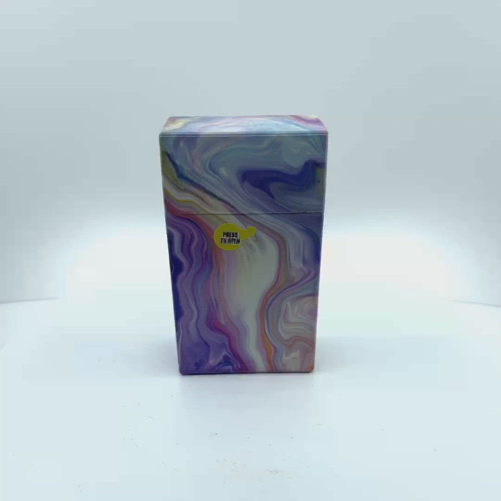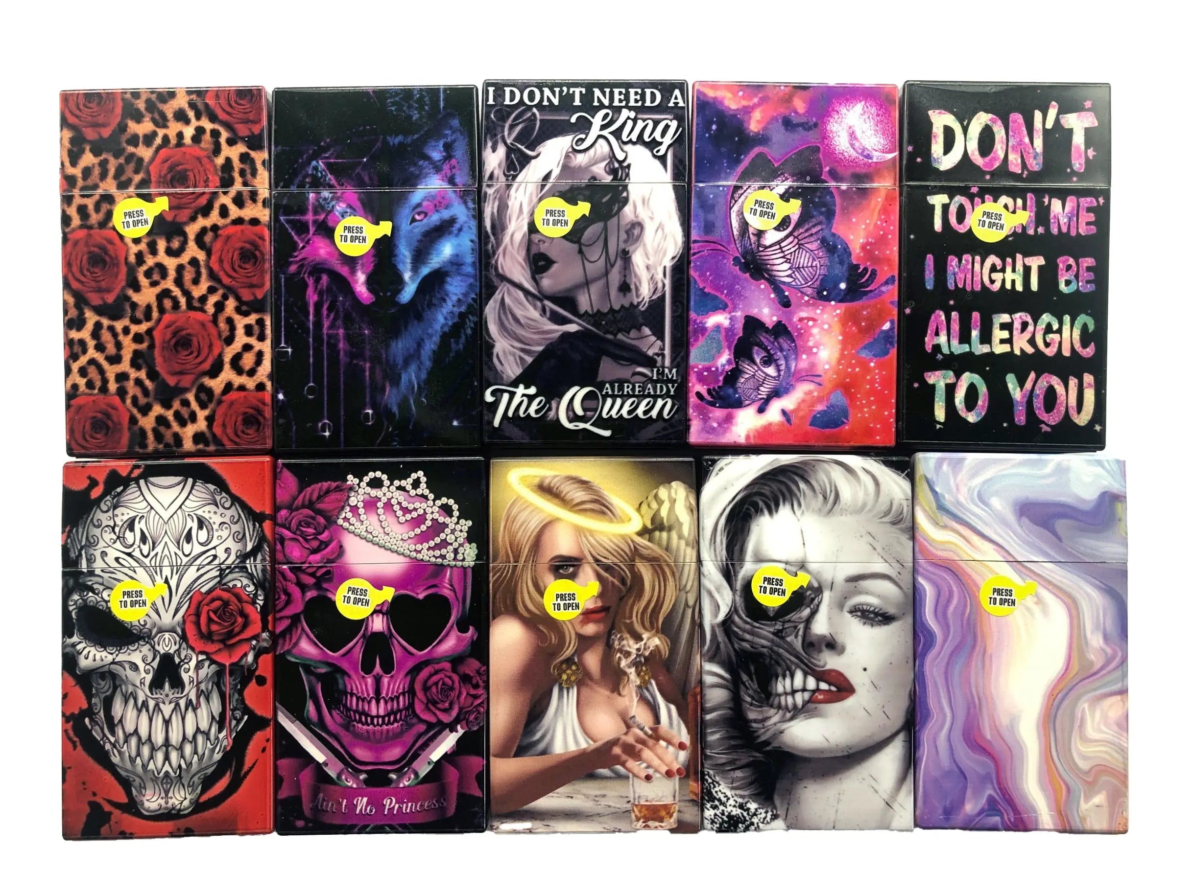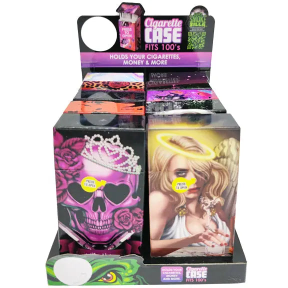 This 100's cigarette case is perfect for storing your cigarettes, money, and more! Fits 100's sized cigarette boxes. Never crush your pack again! Push to open. Comes in assorted feminine and vixenish designs.