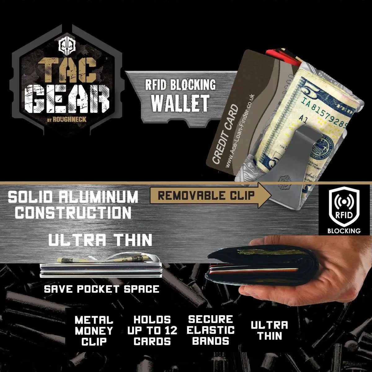 This RFID blocking wallet is solid aluminum and has an ultra thin clip. It saves space, holds up to 12 cards, is RFID blocking, and has secure elastic bands for additional storage!