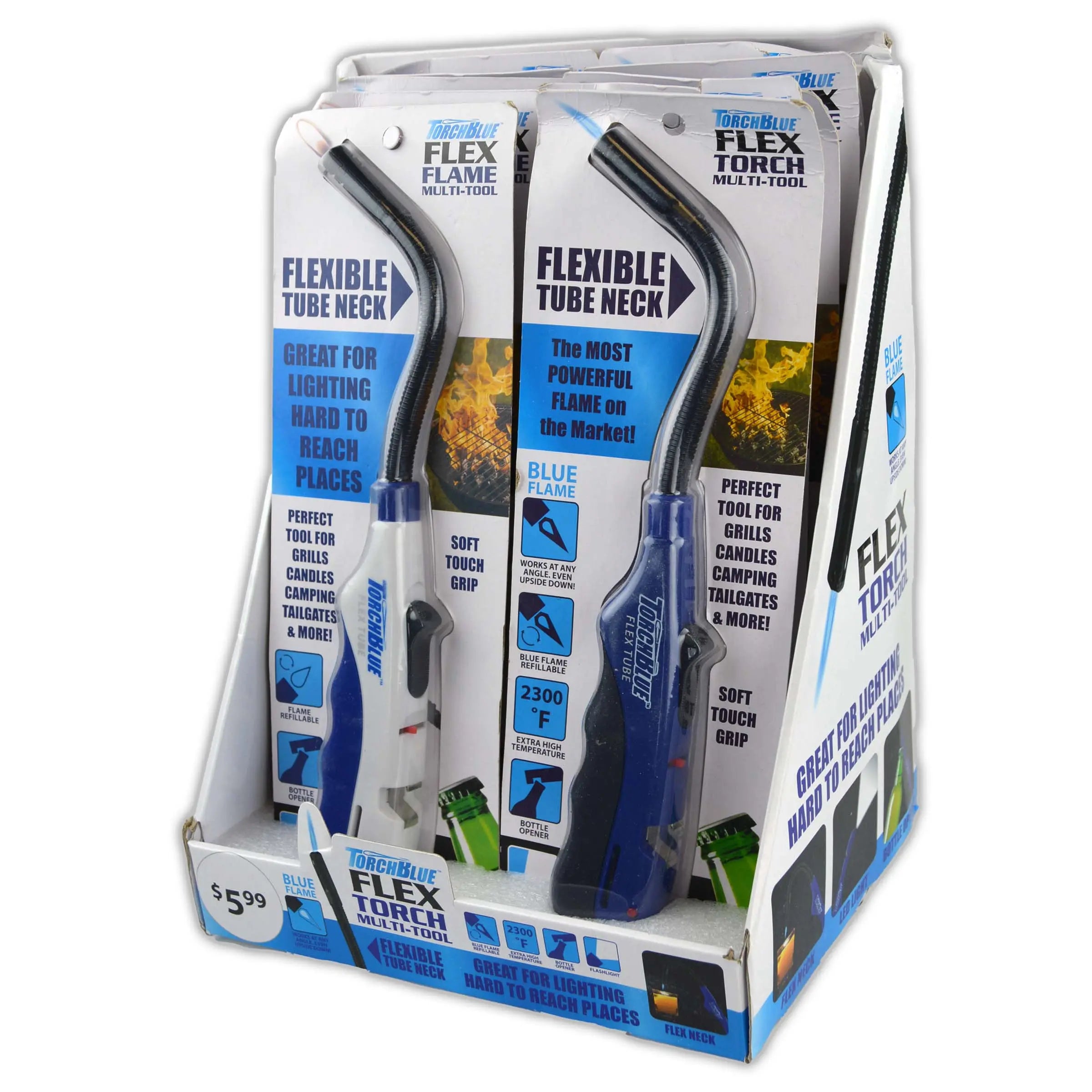 Great for grilling, candles, etc. Ergonomic handle for easy grip. Soft coated surface at grip. Bottle opener, LED light and torch flame.