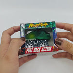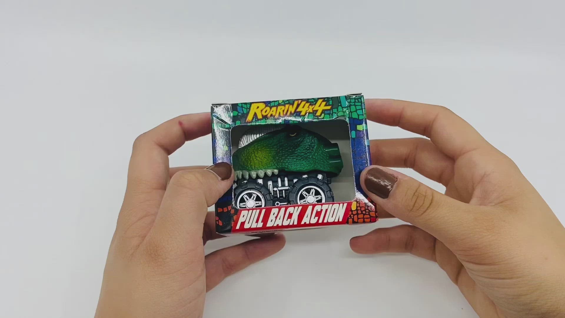 Pull Back ROARin' 4 x 4 Racers. Eight assorted dinosaur styles with super fast pull back action. 24 individually boxed cars in inner box with toy bin card included for use on the So Much FUN! Toy Bin Program corrugated display or in the clear toy bin pockets. Product fits tall bins.