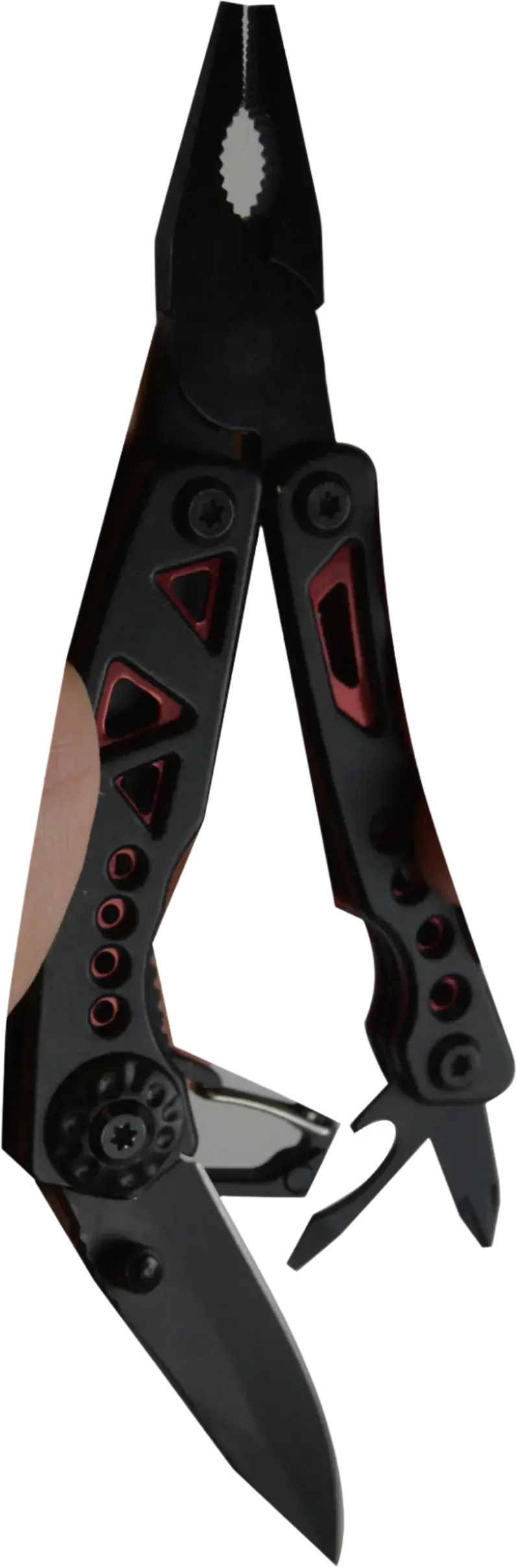 This Tac Gear Multitool is medical grade stainless steel. It has pliers, a screwdriver, a bottle opener, a belt clip, a knife/blade, and it folds compact.