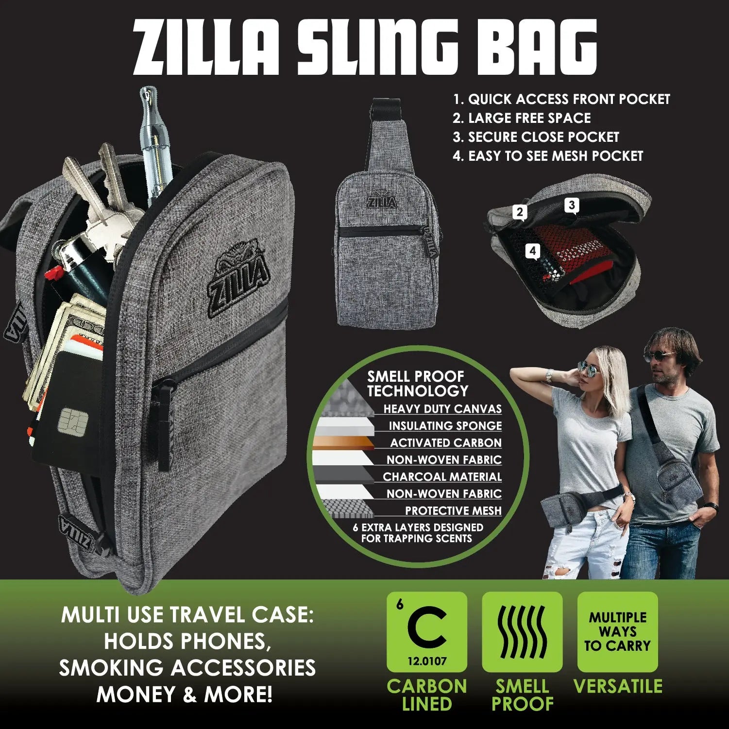 SMELL-PROOF Zilla Sling Bag has you covered! This multi-use travel bag can be worn as a crossbody bag or on your waist like a fanny pack. Carbon lined filter system designed for trapping scents. Wide variety of uses – holds herbs, smoking accessories, phones, wallet, lotions, chapstick etc.