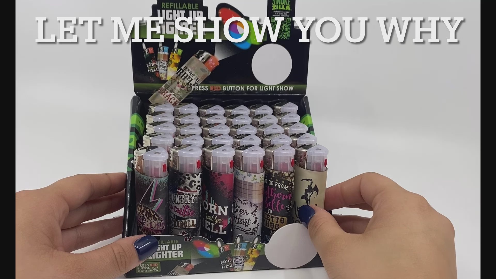 Refillable Light Up Curve Lighter with built-in light show. Comes in assorted designs and sayings!