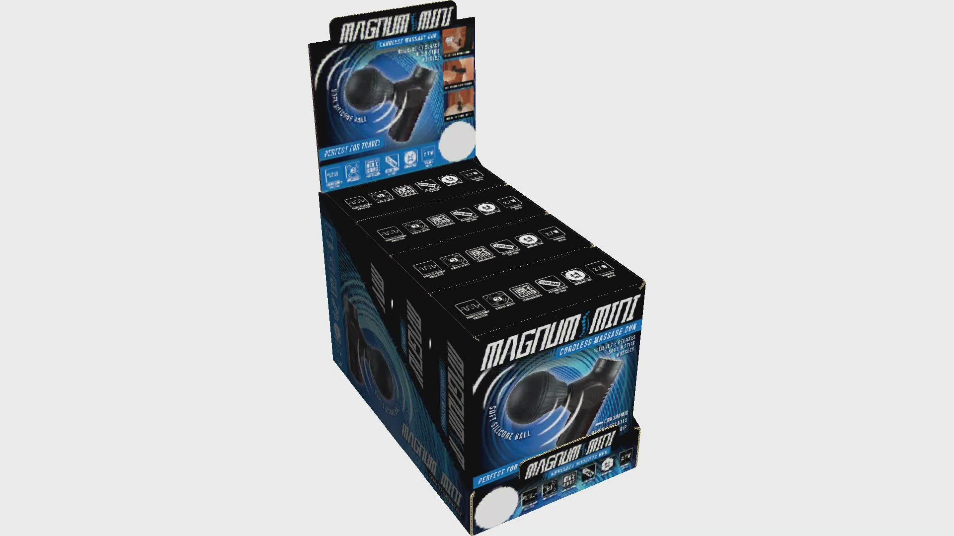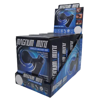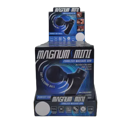 Magnum Mini Therapy CORDLESS Massaging Gun features 1200MAh rechargeable battery, 3 levels of pulsing action, 2.7W brush motor and a sleek soft-touch-finish design. THE IDEAL travel accessory and gift! Each display includes accessories shown. Relieves sore & stiff muscles with 4-5 hours of massage time! Great for athletes, business trips, at your desk and at home! Makes the perfect anytime present.