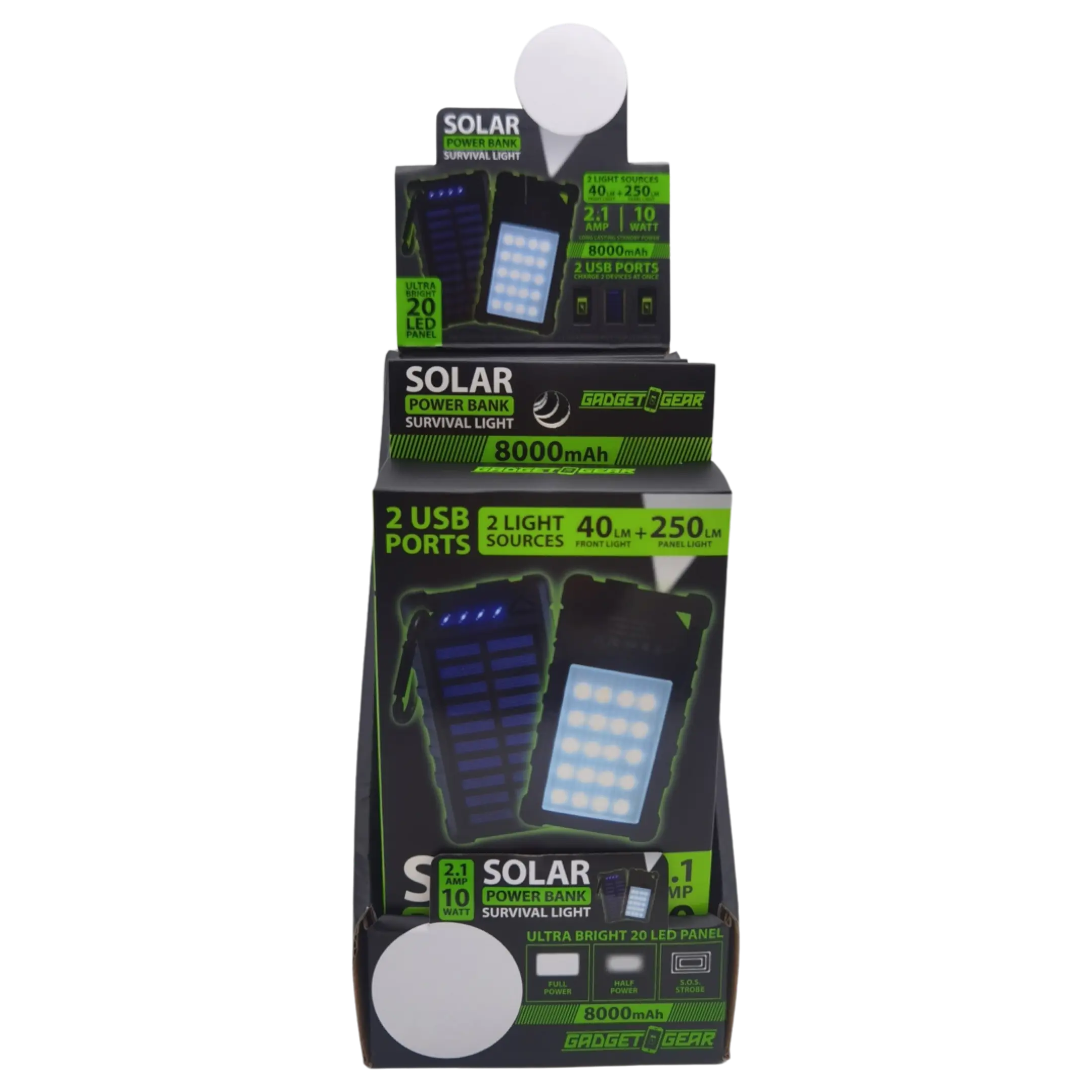 Gadget Gear Solar Power Bank Survival Light. Two(2) light sources! 40-Lumen front light and 250-Lumen panel light. Long lasting standby power. Ultra bright 20 LED panel. Includes carabiner(not for climbing) and charging cable. 2.1-Amp / 10-Watt / 8000mAh long lasting standby power! Rapid charge two(2) devices at once! Three(3) Survival Mode LEDs: Full, Dim and S.O.S Strobe. Perfect for camping, emergencies, travel, fun and more!