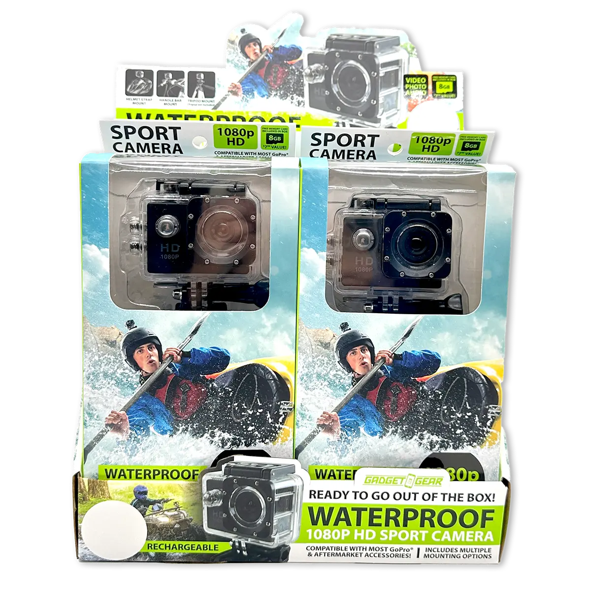 Gadget Gear Sport Camera. Featuring WATERPROOF housing – safe to 100ft! 1080p HD camera. 1.5 × 2-inch LCD. video: 1920 × 1080-pixel 15fps. 1280 × 720-pixel 30fps. Super wide-angle lens: 170º. Rechargeable battery: 900MaH (1.5h.) Includes Adhesive/strap mount. Tripod mount. Switch mount. Bicycle bracket mount. Micro-USB cable – for input, output & charging. Free 8GB micro-SD card – $7.99 value! Compatible with most GoPro® and aftermarket accessories!