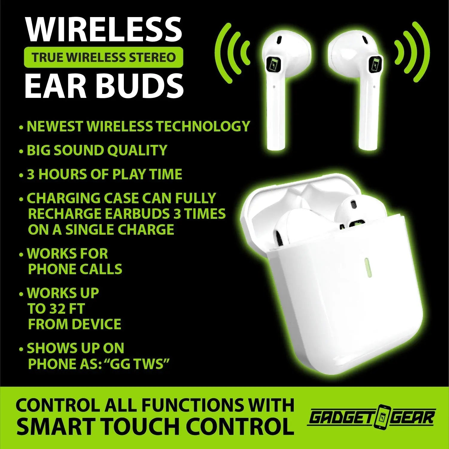 🎧 🎶 Wireless Earbuds offer smart touch controls, 3 hours of play time, and a range of up to 32 feet. Each set of wireless earbuds comes with the charging case and charging cable for the charging case. Charging case can fully recharge earbuds three times before needing to be recharged.