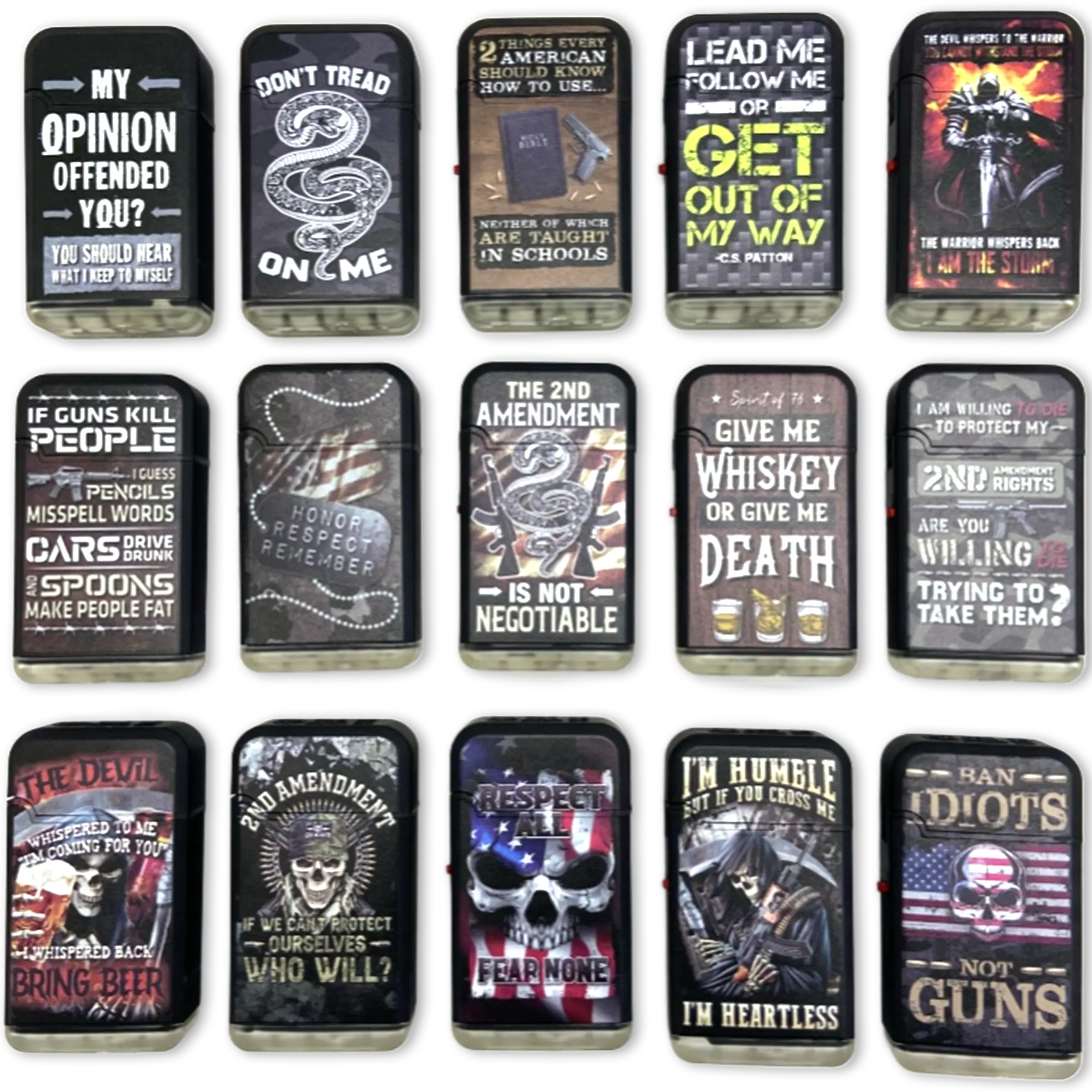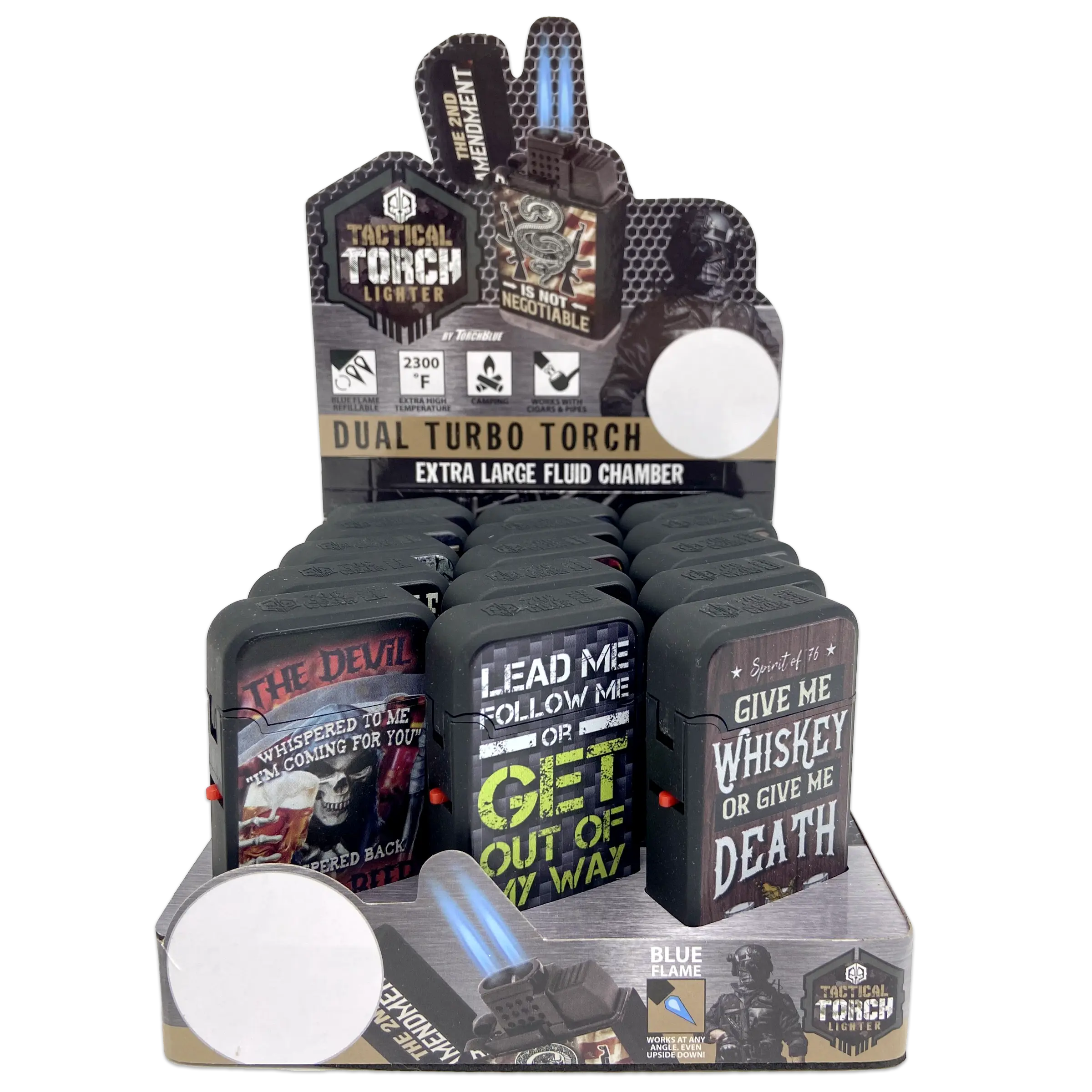 Tactical Dual Torch Lighters feature a 2300° blue flame, perfect for camping, cigars, pipes, and candles. Also has an extra large, refillable fluid chamber – you won't have to worry about this torch going out! Satirical phrase styles printed on soft touch comfort casing.