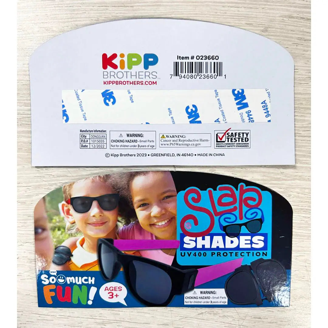 Kids UV 400 protection sunglasses. Wear them or take them off and slap them around your wrist! Assorted colors; pink, red, blue and black. Twelve individually bagged and hang tagged sunglasses per inner box with toy bin card included for use on the So Much FUN! Toy Bin Program corrugated display or in the clear toy bin pockets. Product fits short bins.