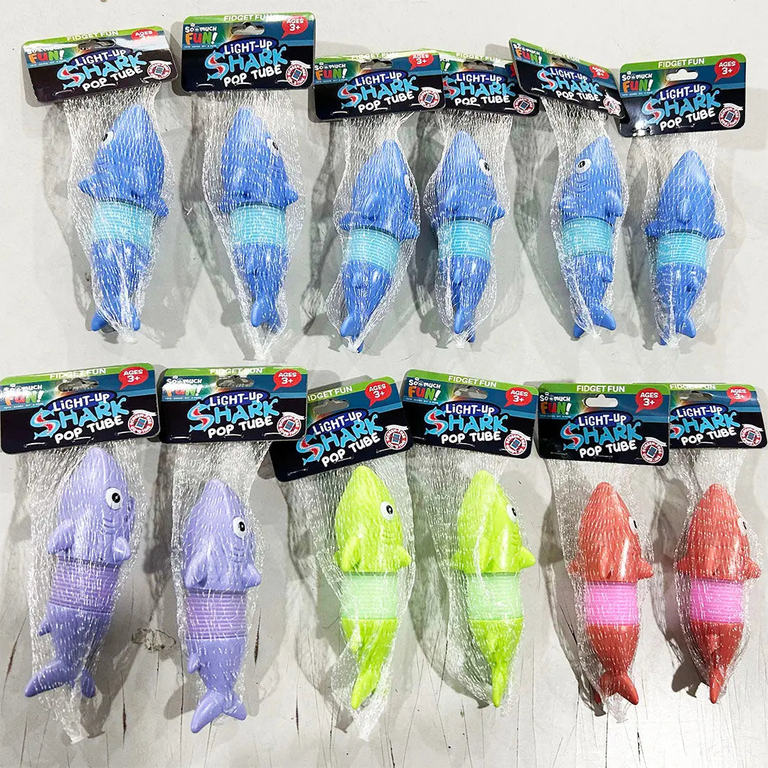 5” Light up bendy shark is a fidget pop tube with shark head and tail. Pull on the head and tail to hear it pop and see it light up. Assorted colors. Twelve individually mesh-bagged sharks per inner box with toy bin card included for use on the So Much FUN! Toy Bin Program corrugated display or in the clear toy bin pockets. Product fits short bins.