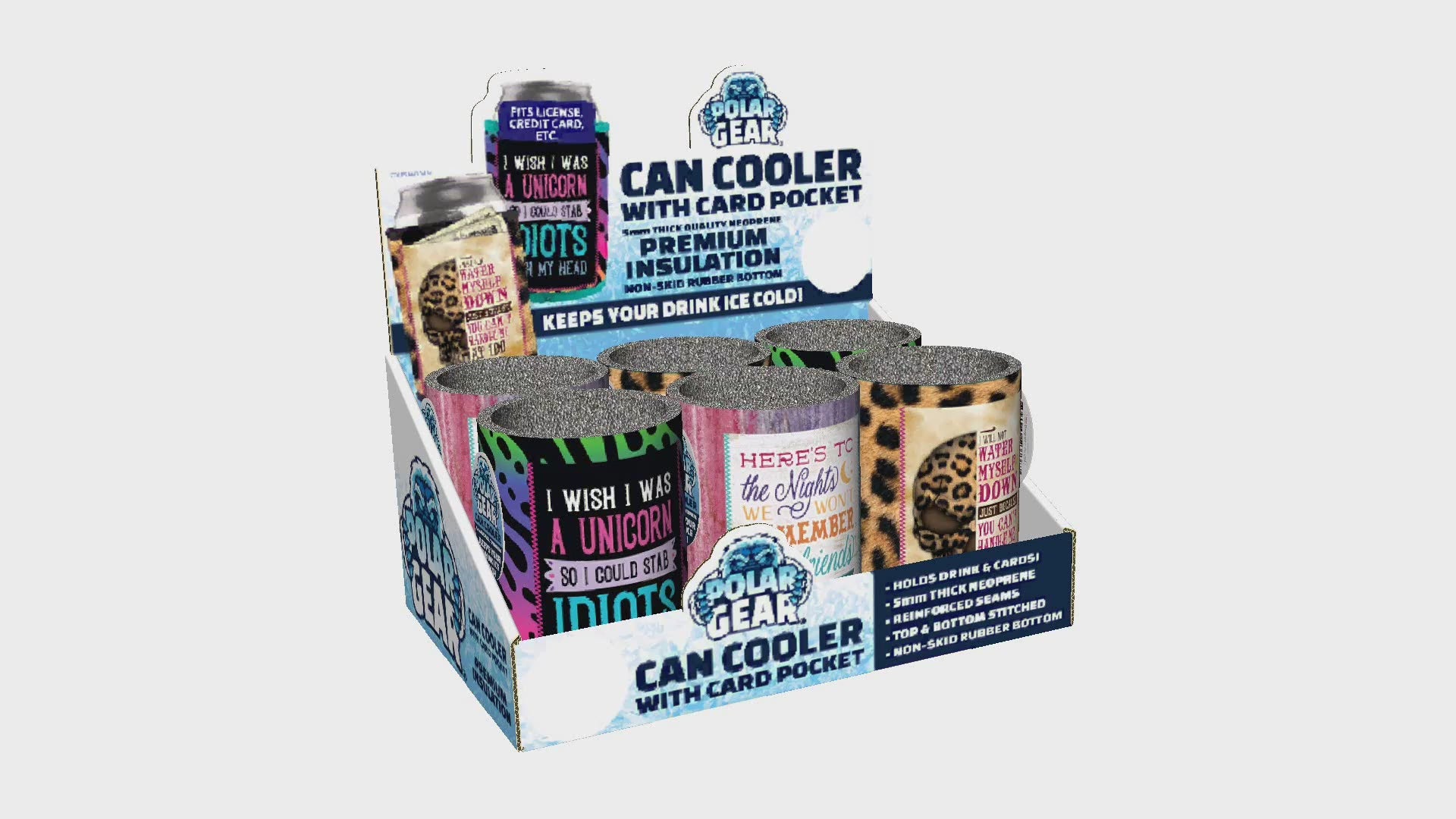 5mm thick neoprene can cooler. Insulated design prevents condensation, keeping hands dry! Top and bottom are stitched to a non-skid rubber bottom that keeps it in place. Each display includes a variety of artwork. Holds 12 oz cans and features a pocket to hold cash, coins, cards, and more!