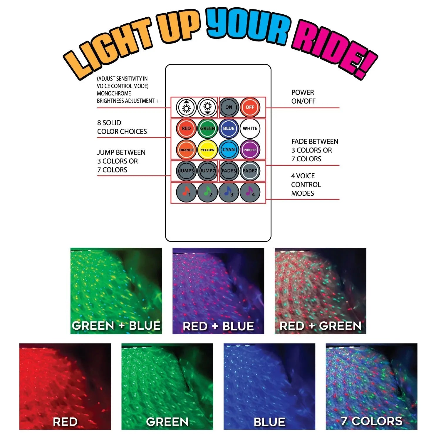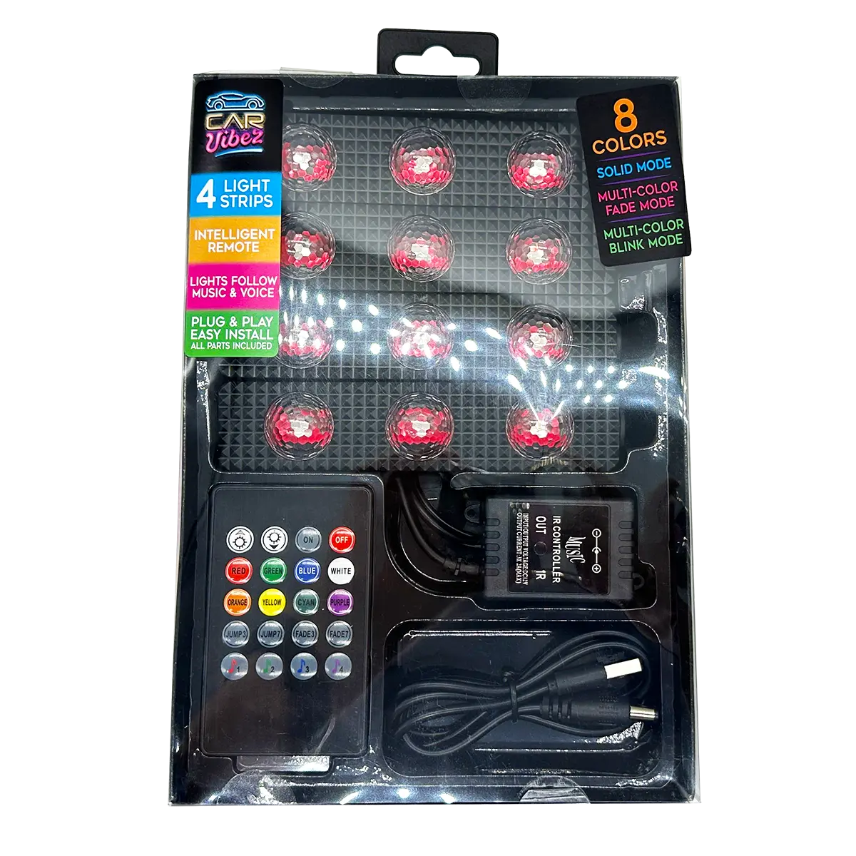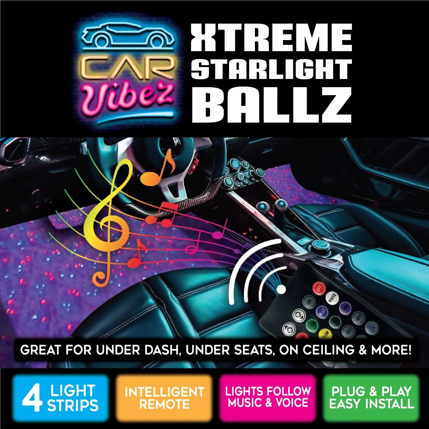 Light up your car with these Xtreme Starlight Ballz! These mood lights have 8 solid colors and multi-color fade or blink modes, so you can customize the look and feel of your car. With its 4 light strips, intelligent remote, and lights that follow music and voice, it's an easy way to liven up your ride! Get ready for an Xtreme experience!