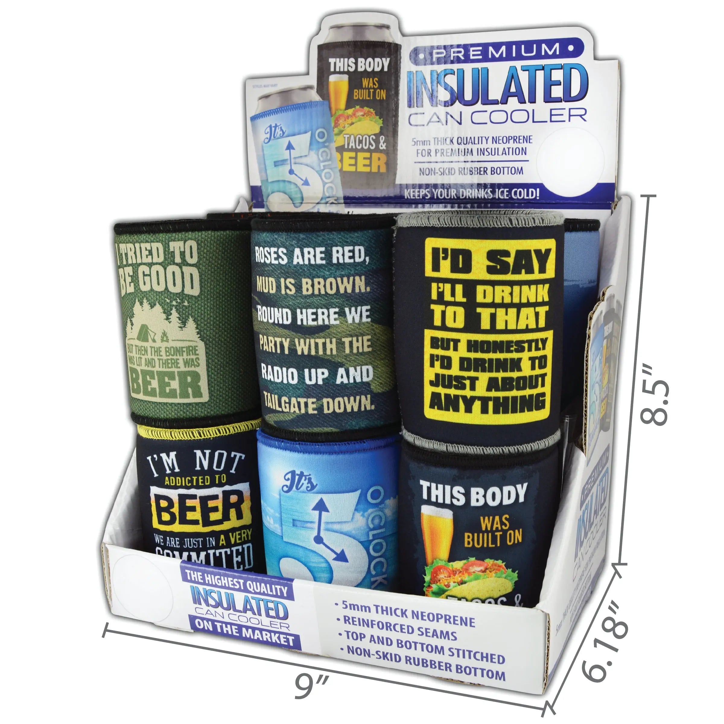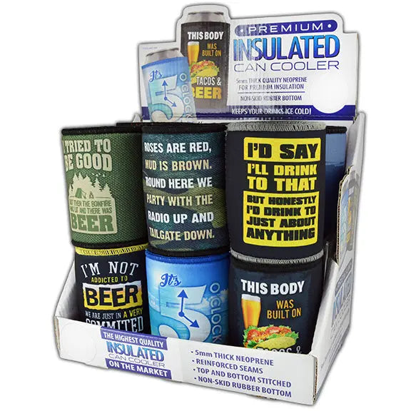 Premium insulated can coolers keep your drinks ice cold! 5mm THICK quality neoprene for premium insulation. Featuring non-skid rubber bottom. Each display includes a variety of artwork. Reinforced seams, top & bottom stitched. Highest quality on the market!