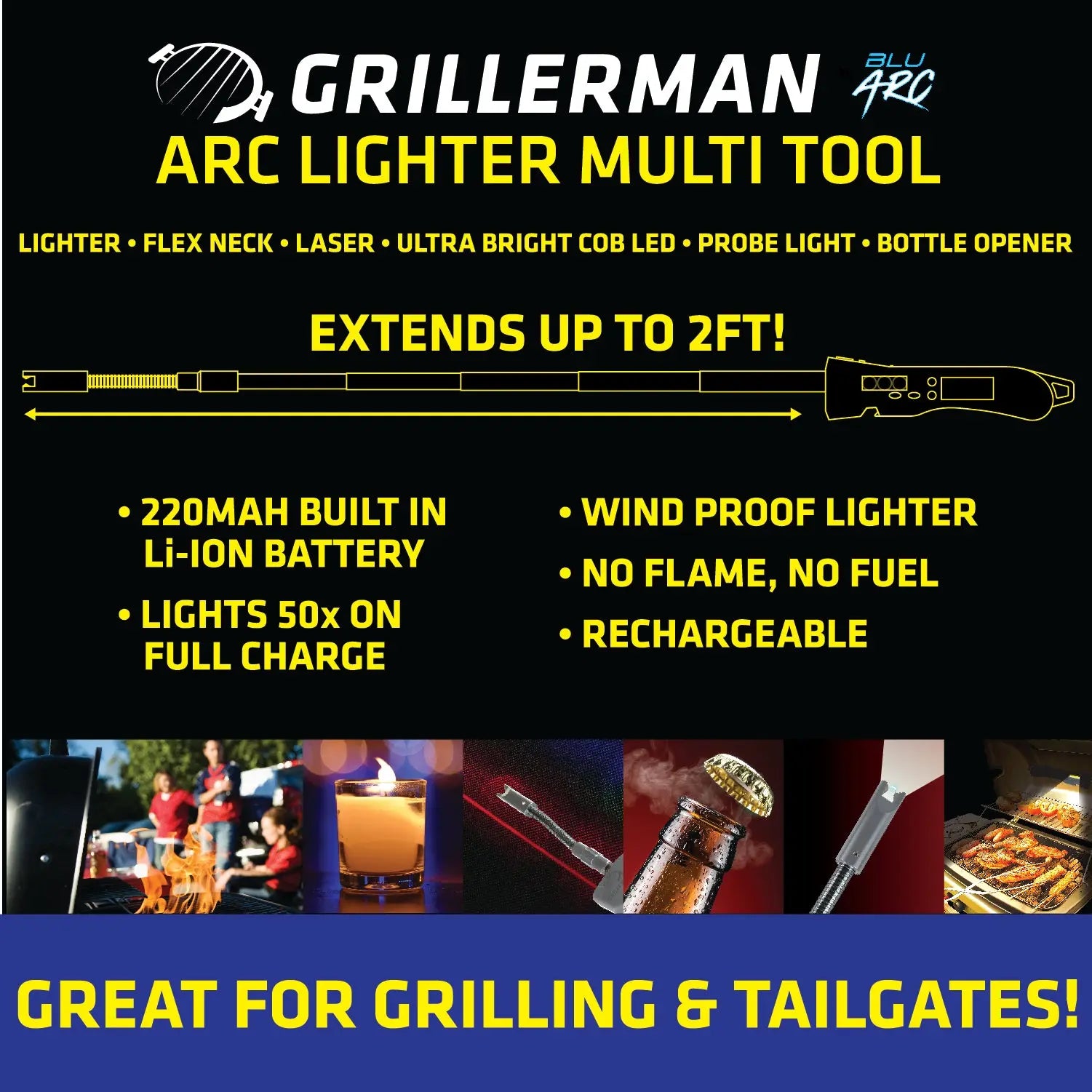 This grill lighter has an extending pole that will allow you to reach down into a campfire, grill or anything else and light it. The LED light at the ARC allows you to see inside the grill. Rechargeable battery, with cord included.