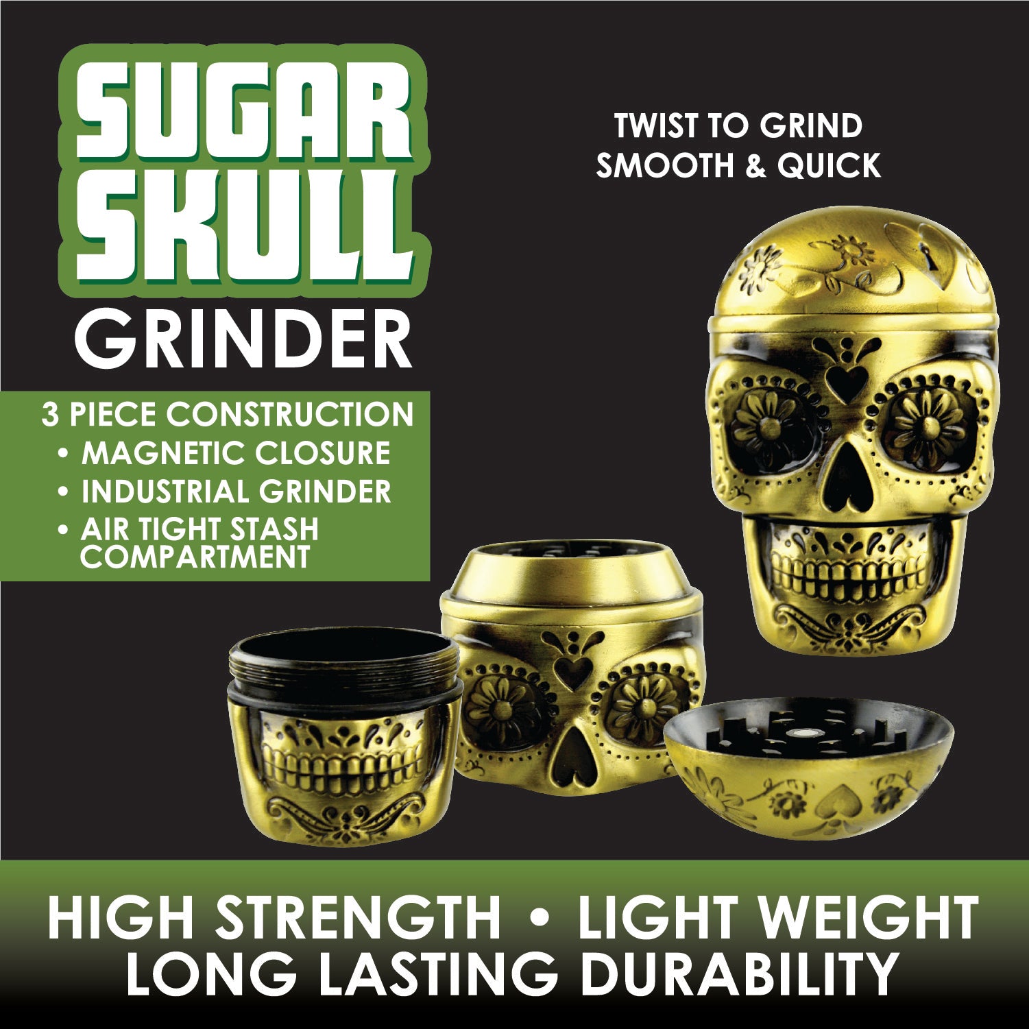 Molded Sugar Skull Grinder Tool. Three-piece construction featuring magnetic closure and an air tight stash compartment. Industrial strength teeth quickly and smoothly grind your goods. Comes in assorted metallic colors and designs.