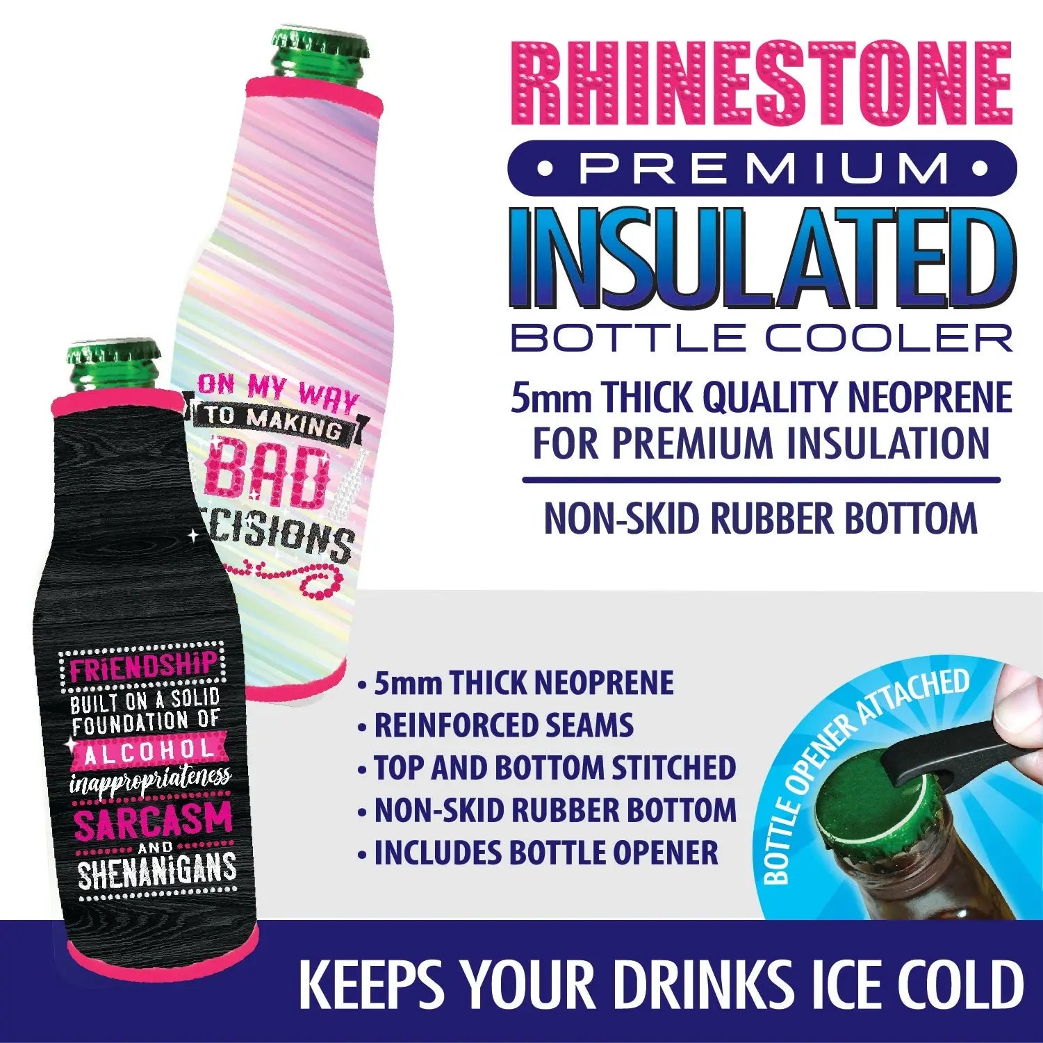 Premium insulated can coolers keep your drinks ice cold! 5mm THICK quality neoprene for premium insulation. Featuring non-skid rubber bottom. Each display includes a variety of rhinestone artwork. Reinforced seams, top & bottom stitched. Highest quality on the market, and bottle opener included!
