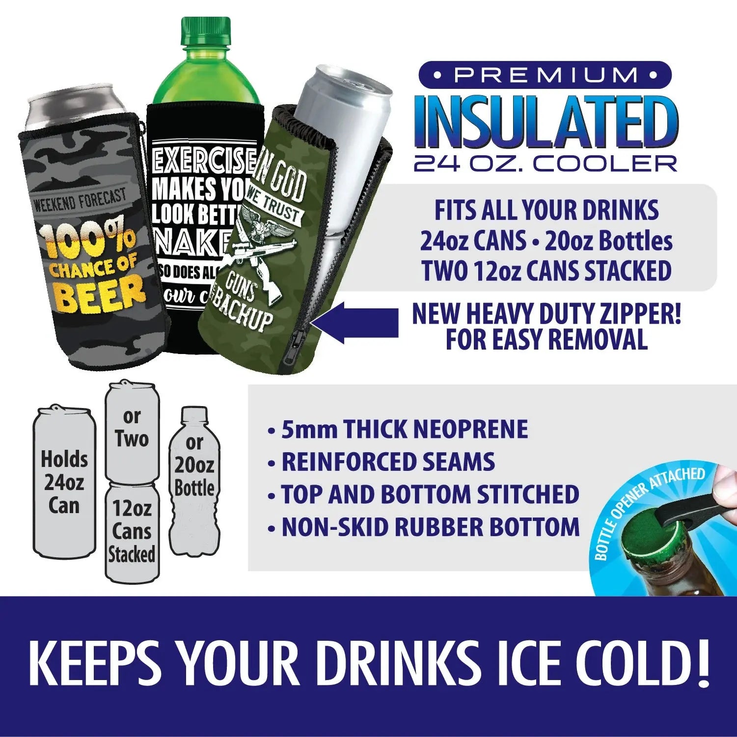 Premium insulated can coolers keep your drinks ice cold! 5mm THICK quality neoprene for premium insulation. Featuring non-skid rubber bottom. Each display includes a variety of artwork. Reinforced seams, top & bottom stitched. Highest quality on the market, and bottle opener included!