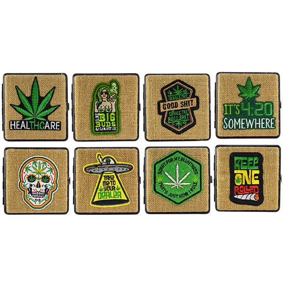 Hinged cigarette case made from all natural hemp. Holds lighter, cash, ID, and cigarettes! Each display includes assorted patches on the top of each lid. Comes in an assortment of SPICY ZILLA🌶︎designs.