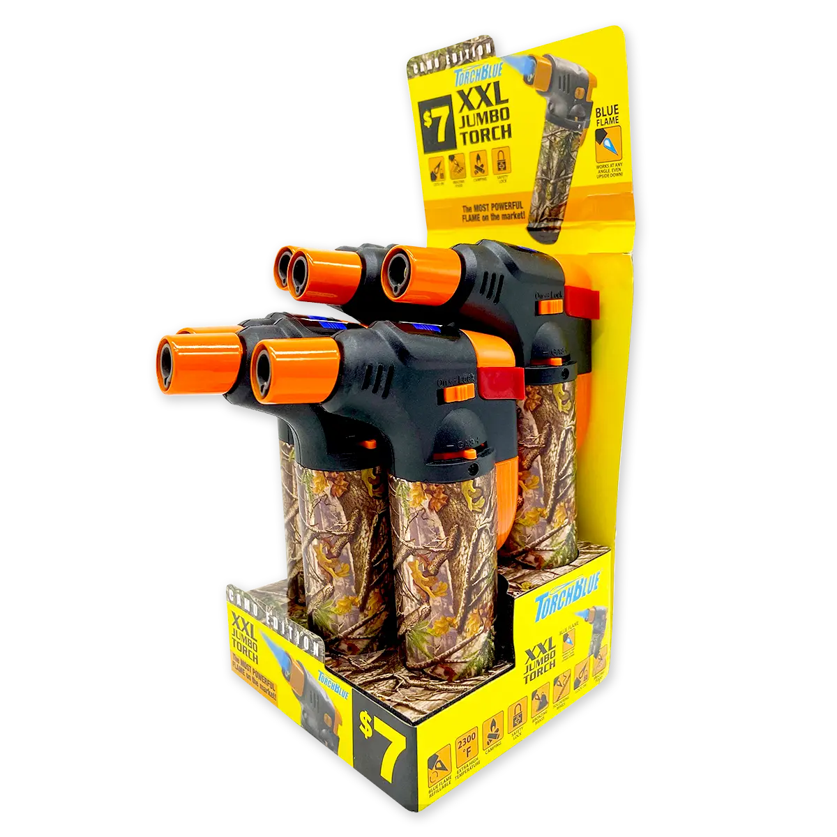 Refillable Torch Blue XXL style torch lighter in Camo edition. This high powered torch has a 2300° flame which is more than enough for any task. Great for camping, bronzing metal, soldering wires, flaming food, and more! Comes with a built-in safety lock. Works at any angle, even upside down!