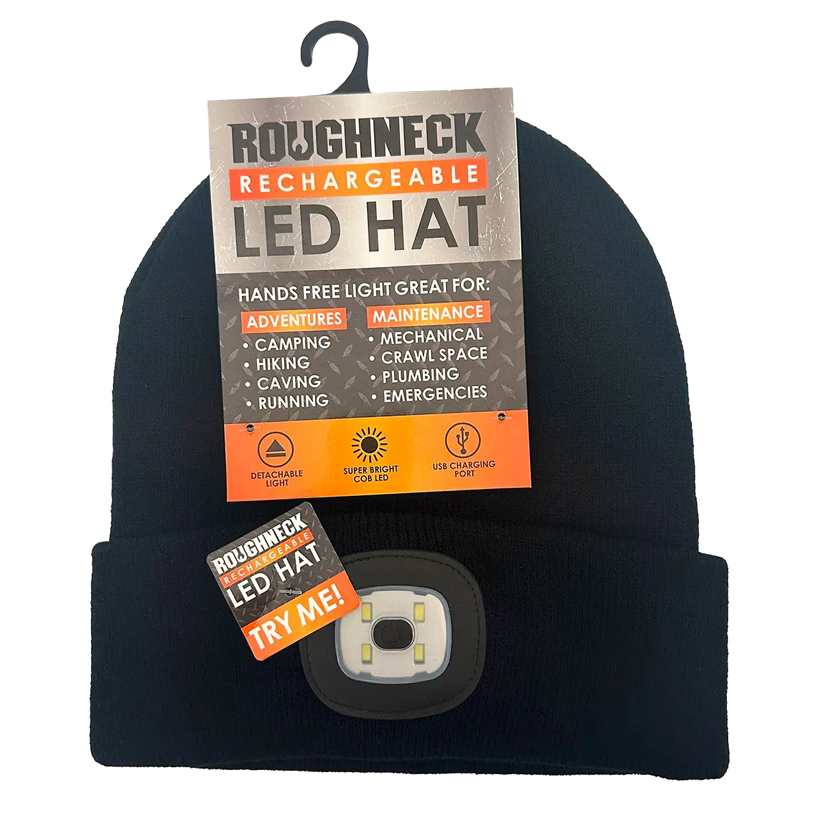 Rechargeable Black LED Hat provides hands-free-lighting; great for adventures and maintenance! Features exclusively secure notched design — simply align the light's notch with the hat's groove, then snap together! Detachable USB light requires ZERO CABLES. Simply remove the COB LED light from your hat, and directly charge via any USB port. Each hat features heavy duty insulation for extra warmth. Adult sizes. Features hang tag and j-hook for ease of merchandising.