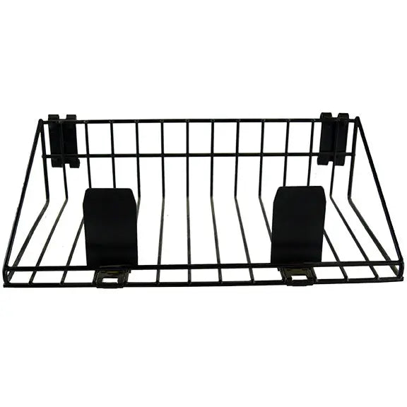 Tech Shelf featuring spring-loaded product pusher. For use with hanging grid panels.
