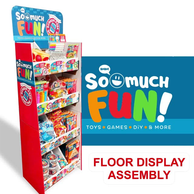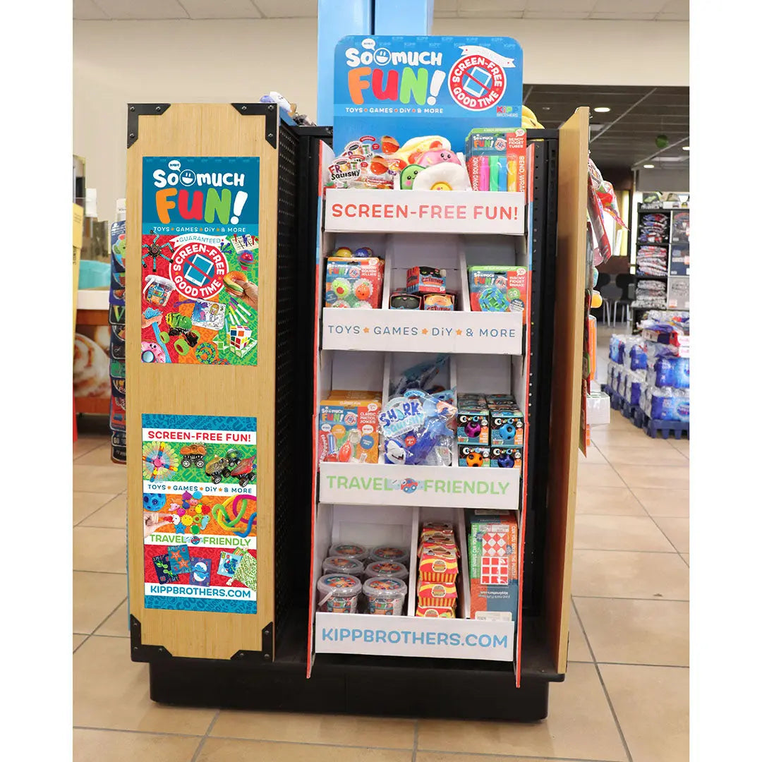 So Much FUN! Corrugated Bin Floor Display merchandises 12 on-trend, travel-friendly, and screen-free fun toys, games, DIY and more. Will continually be the latest hot items with new introductions weekly.