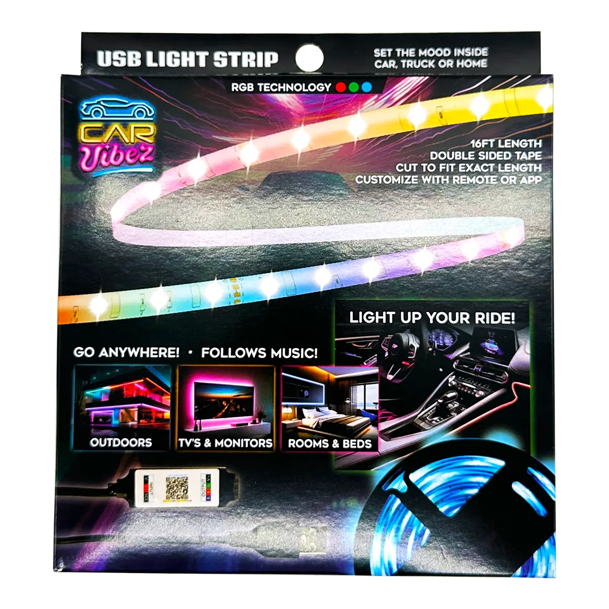 Light up your ride with this USB LED Mood Light Strip featuring 16FT length and waterproof coating. Create up to 60,000 color combinations with RGB technology and adjust brightness and patterns with the remote control. Double-sided tape allows for easy installation and portability, so you can go anywhere - from your car ceiling to your TV! Set the mood in any room with this LED Mood Light Strip. Equipped with RGB technology, you can control all color combinations with the remote control. Easily adjust to your choice. Plus, the lights can follow the beat of your music – perfect for a party!