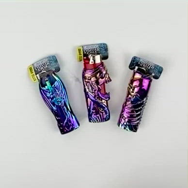 Mystic lighter cases that fit BIC® lighters. Assorted designs with some styles featuring a bottle opener. Finished with an iridescent RAINBOW style look.
