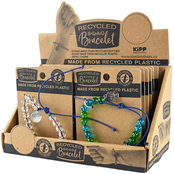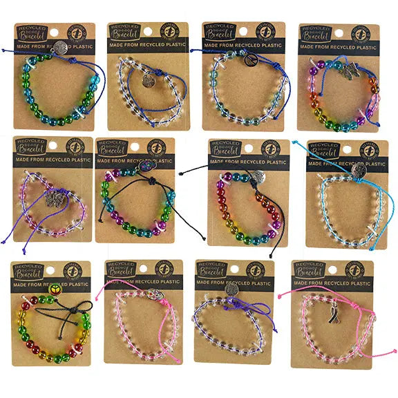 Colored bead bracelets with metal charms made with plastic from recycled bottles and other recycled plastic. Comes in assorted colors.
