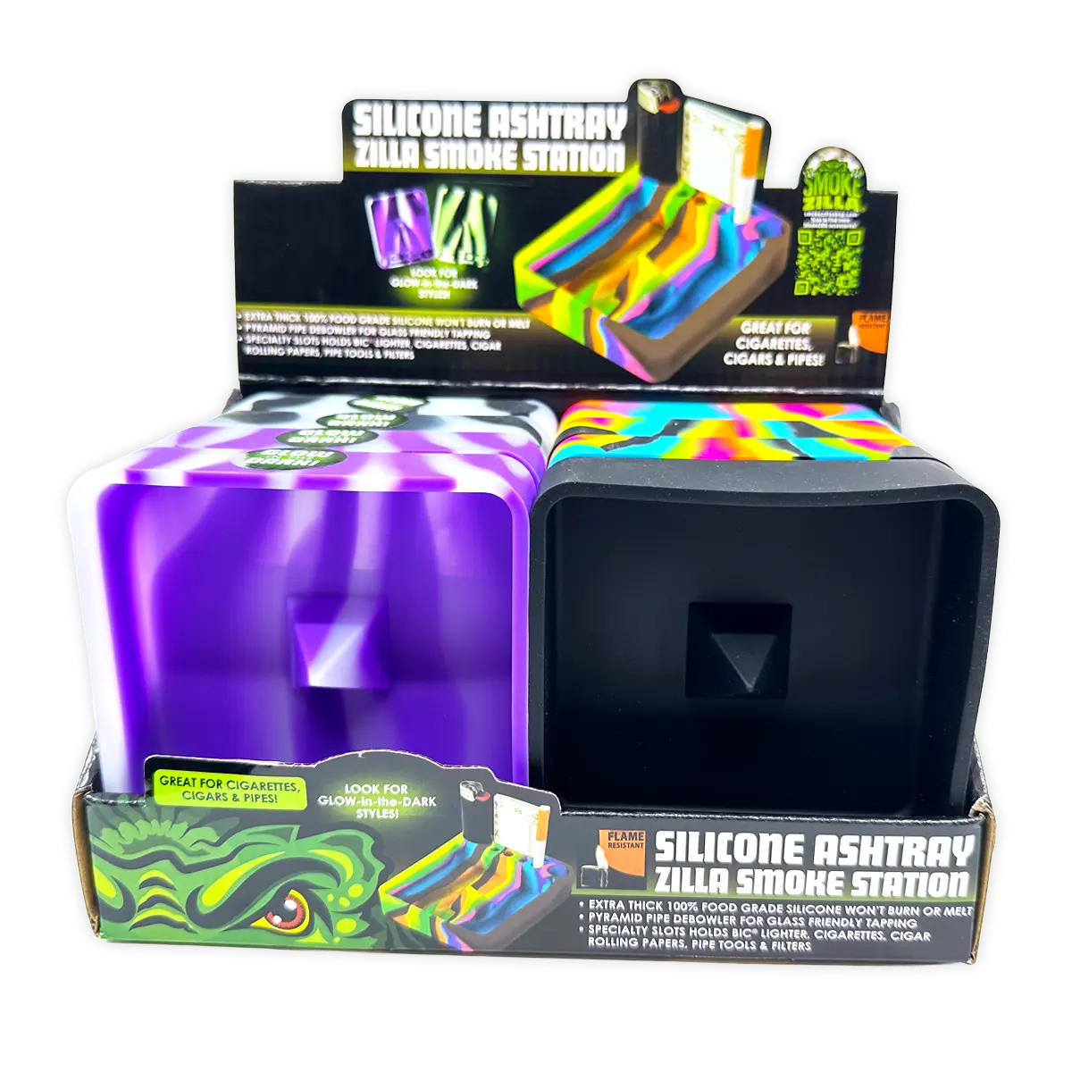 Ashtray made from 100% food grade silicone and will not melt or burn. Has built in pyramid pipe debowler for glass friendly tapping and specialty slots for lighter, cigarettes, cigar, rolling papers, pipe tool and filters. Assorted colors including surprise glow in the dark styles.